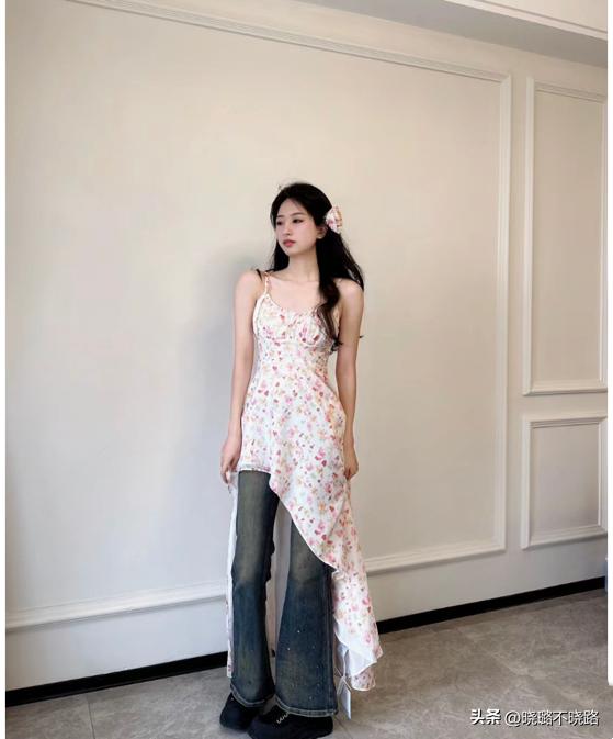 爲了避免視覺效果給人過於拖沓的感覺,我們在選擇裙裝的時候,可以優先考慮那種前短後長的設計。這樣與褲子進行搭配的時候,不僅可以有效地延長腿部線條,讓我們的腿部更加修長。同時也可以讓我們的視覺比例更加協調,穿出更加顯高的穿搭效果。