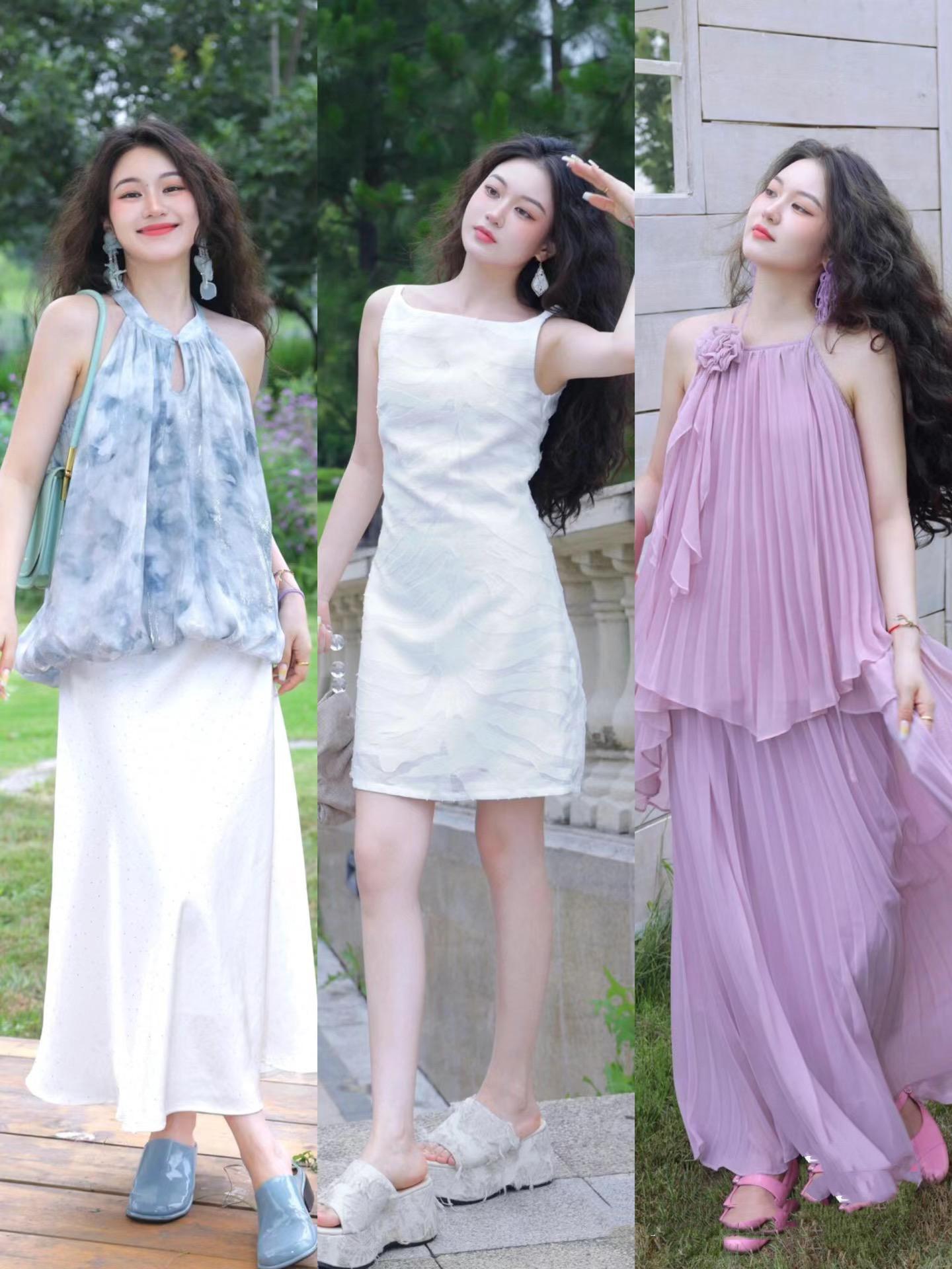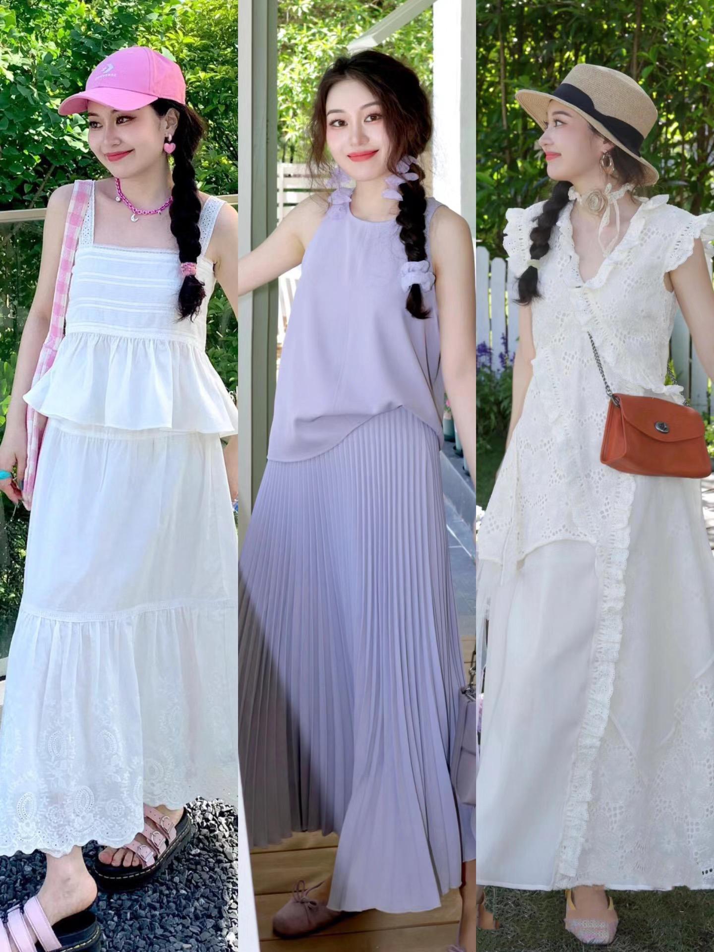 如果擔心自己駕馭不了純紫色,可以嘗試這種粉紫色。掛脖上衣+百褶裙的套裙,配上同色系的耳環,氛圍感又了、拍照也是很出片。