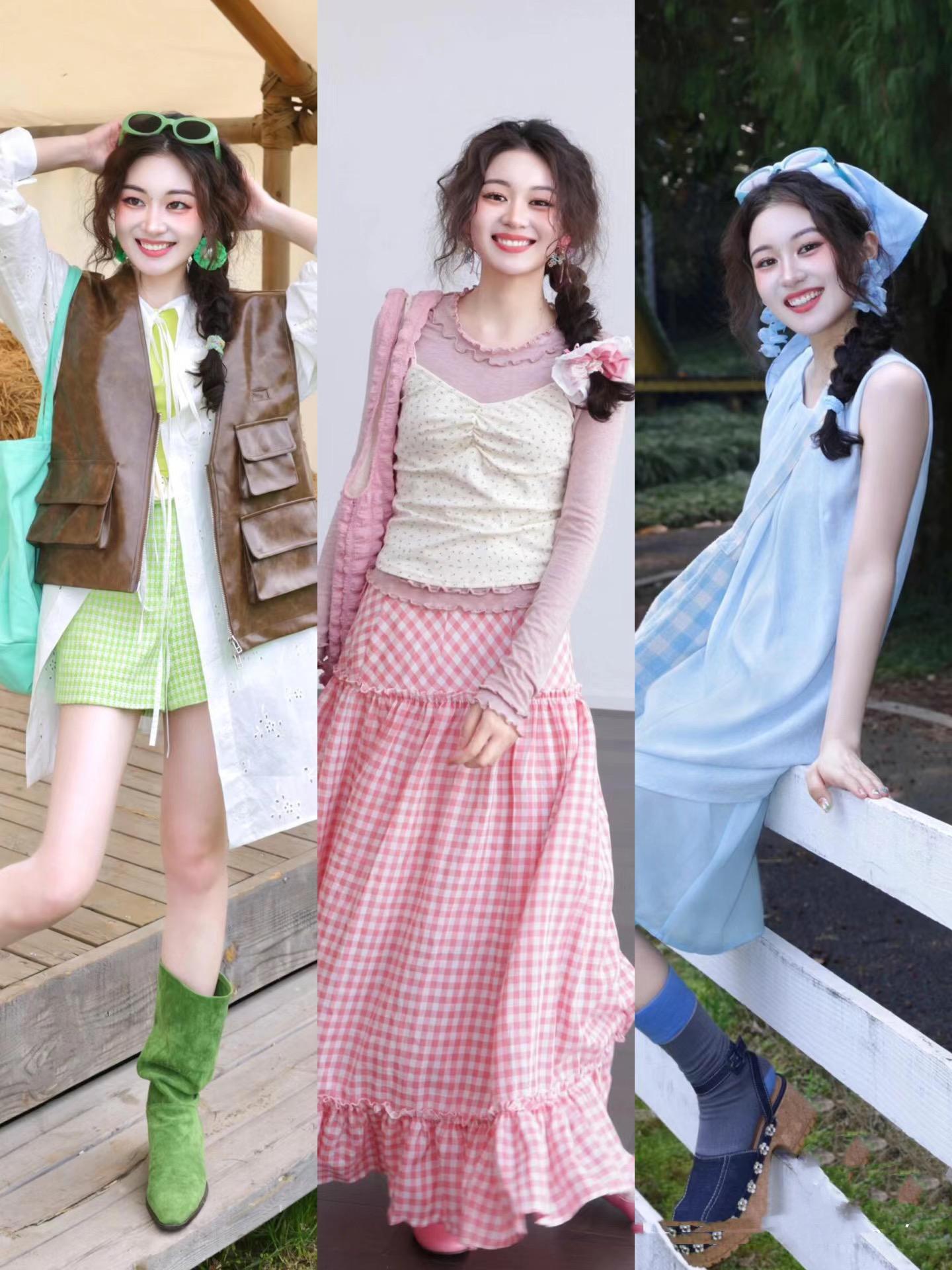 這種格子元素的半身裙,粉白相間的配色自帶小女生的清甜之氣。同色系的單肩包、褶皺感的頭花,爲整體穿搭增添了浪漫氛圍。