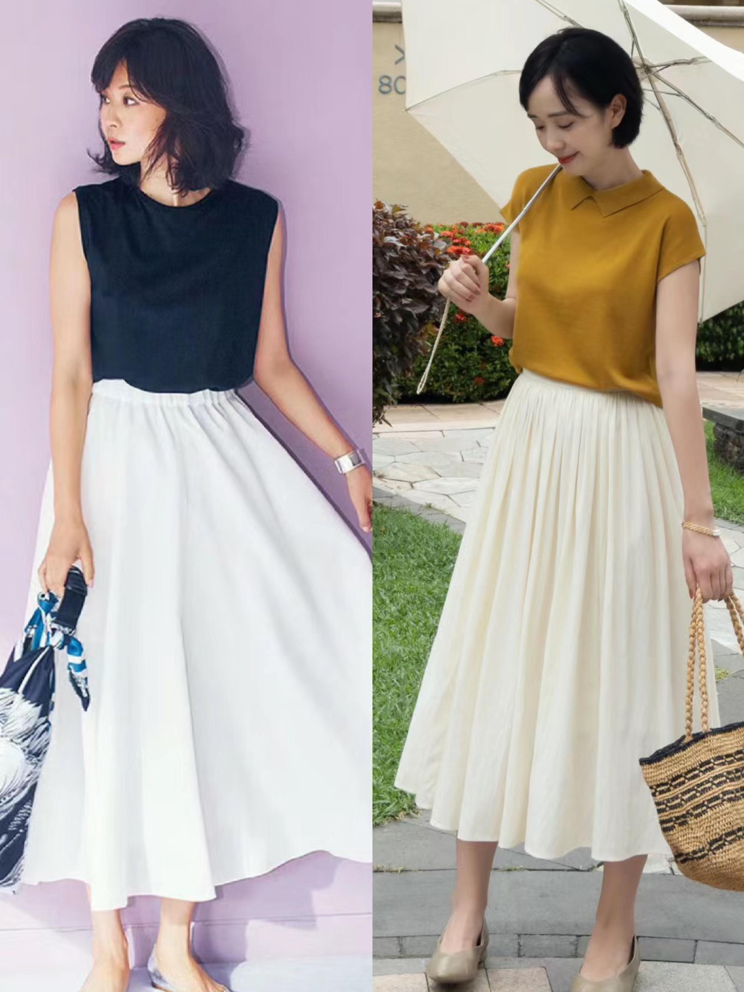 夏天裏想要弱化年齡感,也喜歡更清爽時尚的造型,就用無袖的T恤來搭配白色傘裙吧。T恤的面料儘量輕柔一點,不需要太過硬挺,否則容易顯壯。
