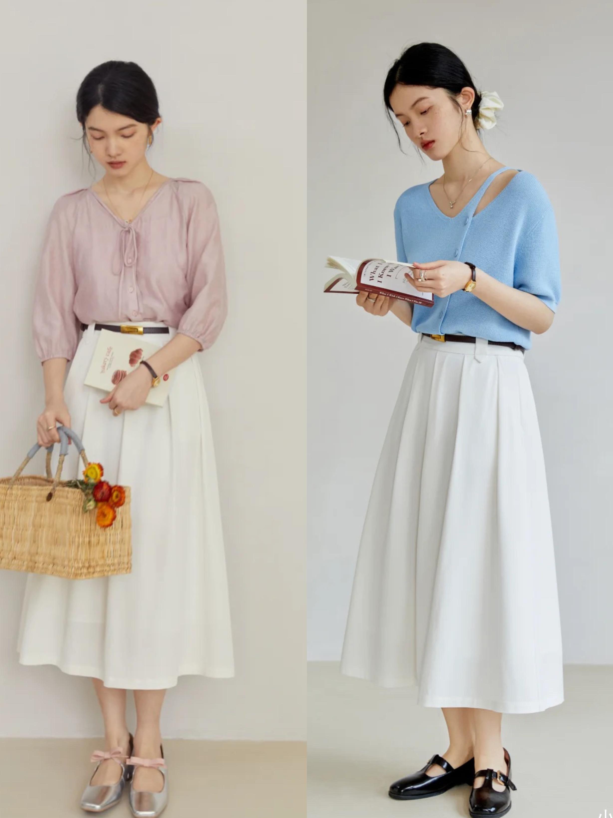 瞭解傘裙的選款,也要懂得傘裙的搭配。不同款式的傘裙,也擁有不一樣的搭配方式。比如白色傘裙,是輕柔的、減齡的、可以營造出無齡感氛圍。