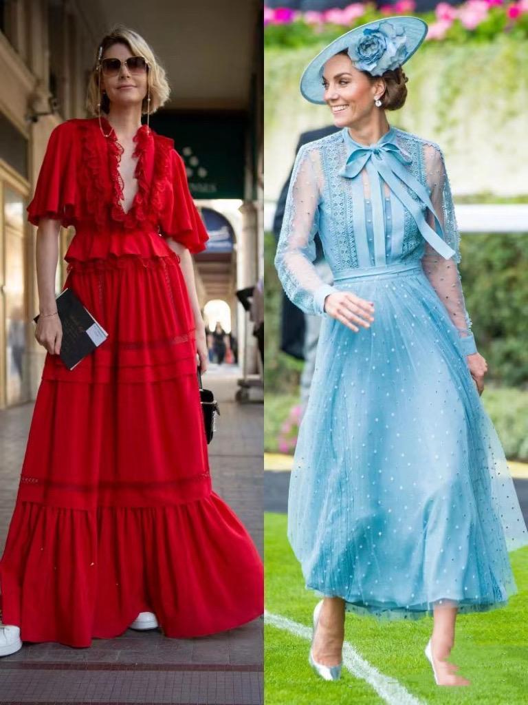 凱特王妃穿着傘裙,就更具王室典雅。淺藍色的波點元素、輕薄的衣袖、流暢的蝴蝶結飄帶,同色系的簪花,浪漫絕美。
