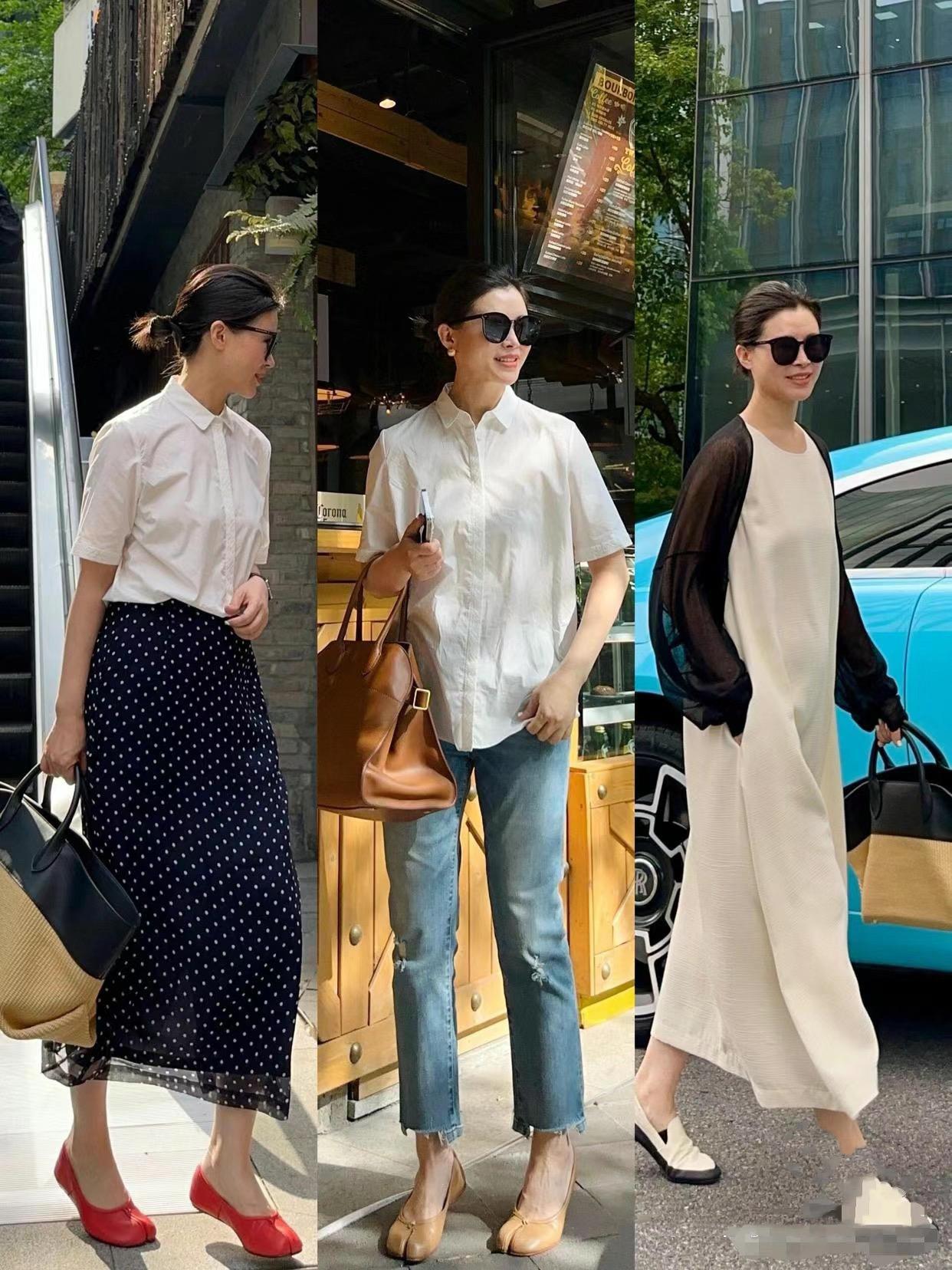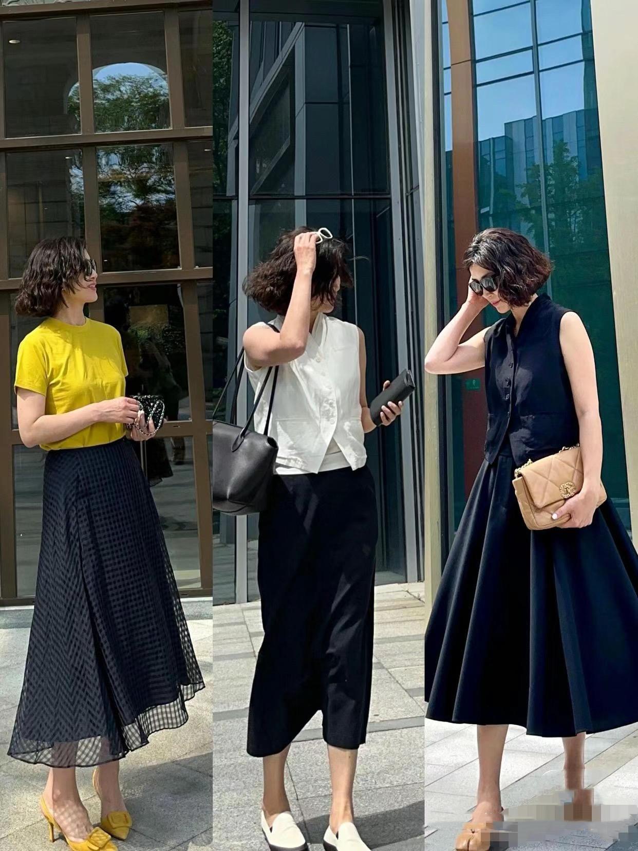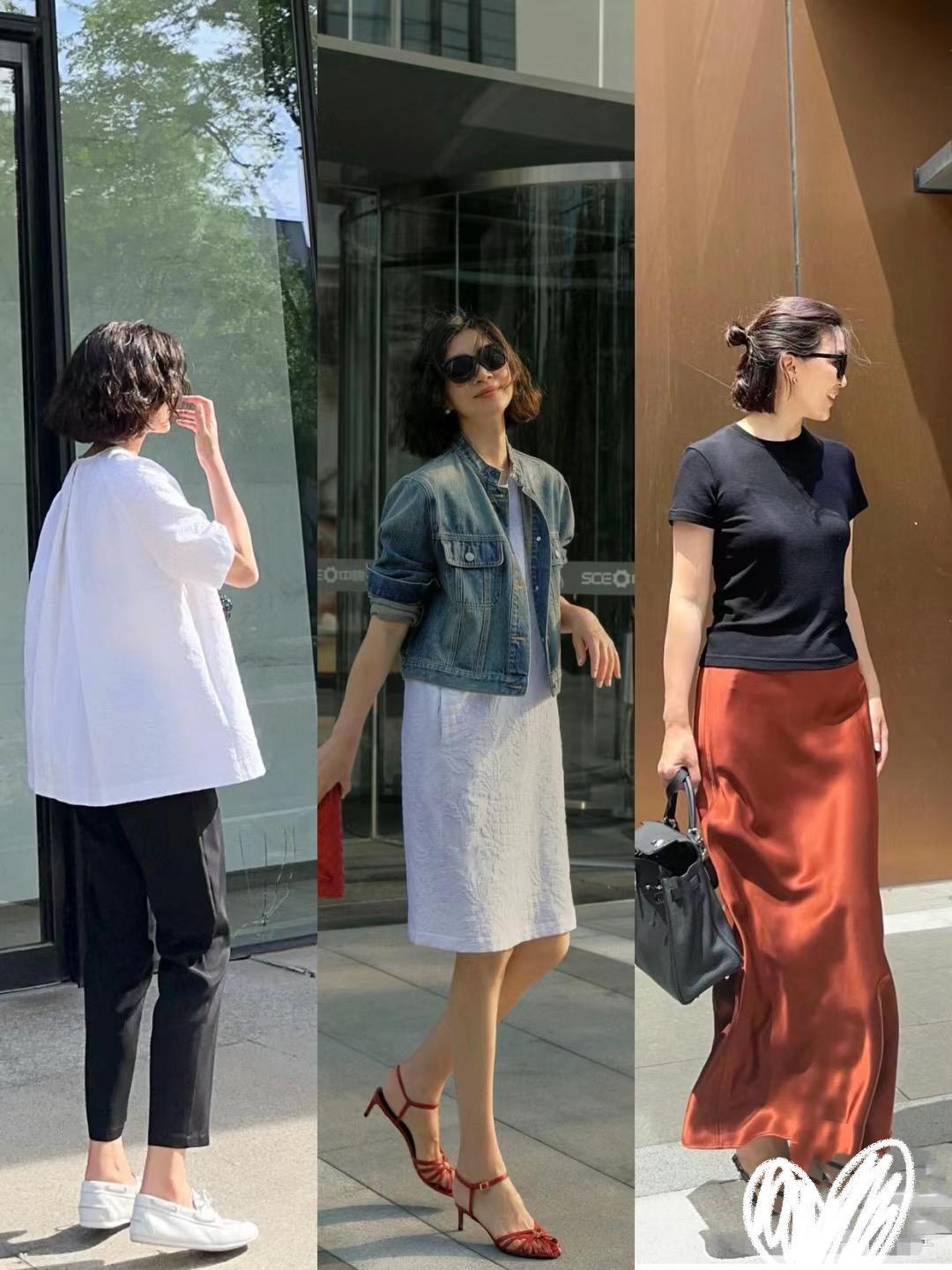 休閒風的穿搭,清爽、簡潔、舒適,可以模糊年齡感,也沒有任何土味油膩的姿態。白襯衫配半身裙、或者牛仔褲,都是清爽利落的。