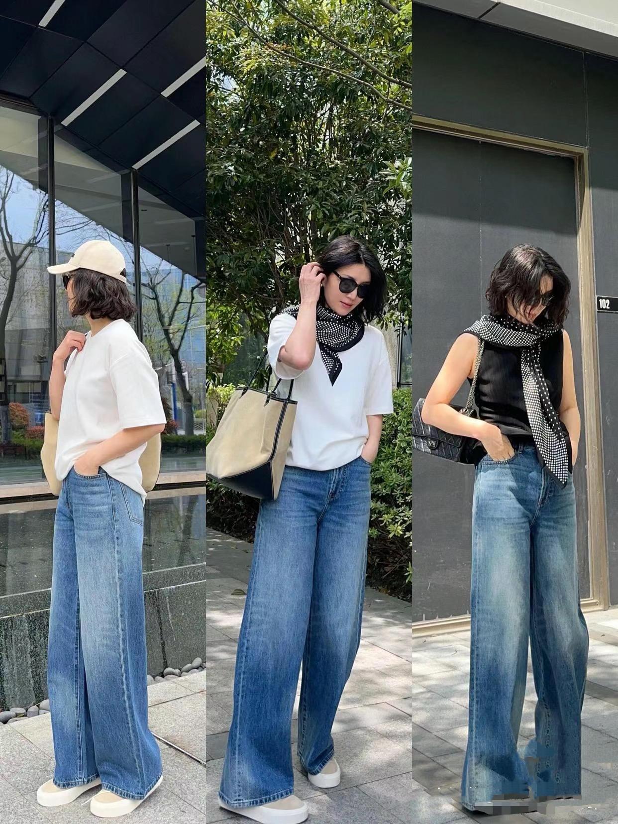 藍色系的直筒牛仔褲,可以搭配相對寬鬆的版型,抬高腰線又修飾腿型。我們穿直筒牛仔褲可以配純色系的T恤或者小背心,有一種清爽酷颯的美。