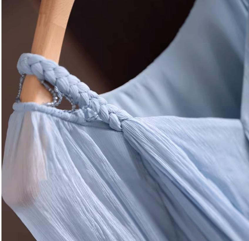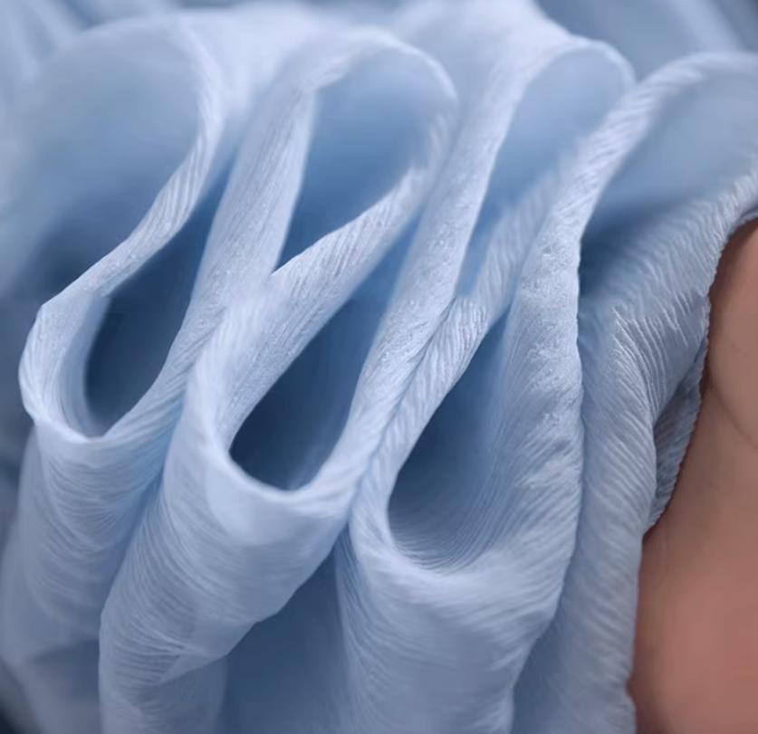 雪紡,其實就是我們常說的“喬其紗”,也叫做“喬其縐”,它是那種輕薄、飄逸的面料,夏天穿起來特別舒服,感覺整個人都飄起來了~現在市面上的雪紡大多是合成纖維的,摸起來又滑又軟,穿上身特別舒服,而且垂感也很好。