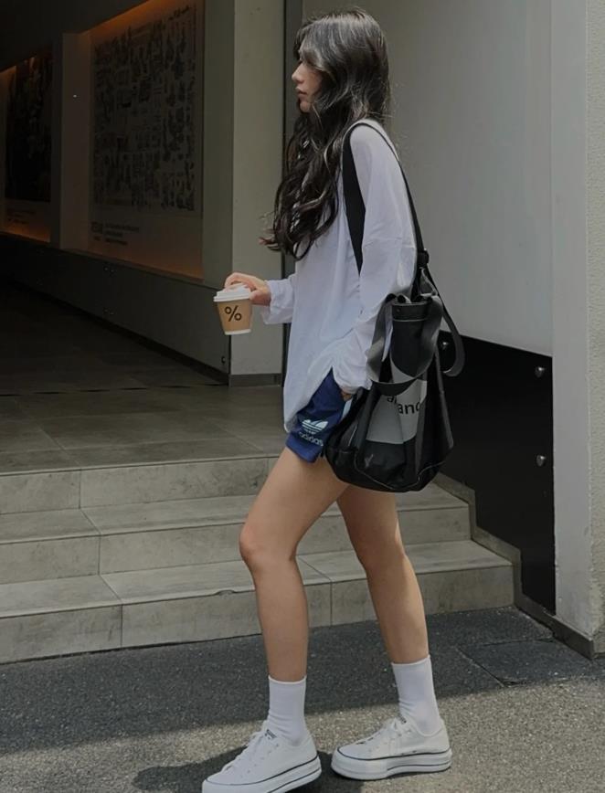 乾淨的白色長袖t恤,透氣性極佳的面料,很柔軟舒適,加上寬鬆的版型,最是藏肉和顯瘦了,選擇一條運動短褲來配,一整個休閒舒適和隨性。上長下短的組合,下身比例瞬間就被拉長了。