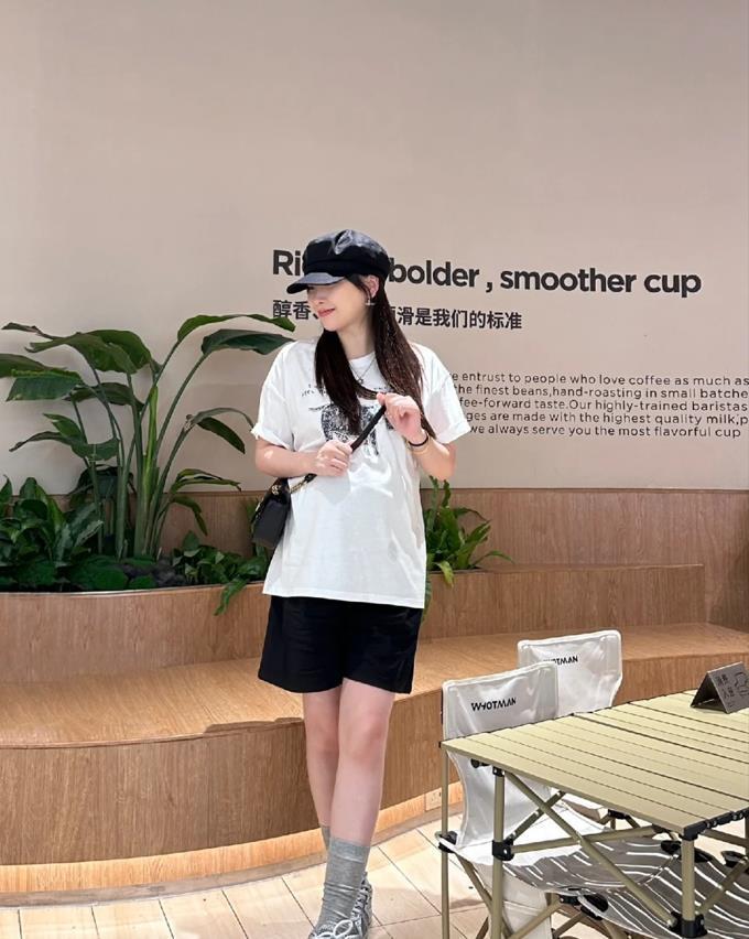 寬鬆的短袖t恤+黑色短褲,這一套簡直就是爲了小個子女生量身打造的吧,整個配色是由深淺結合組成的,十分顯層次感,寬鬆的短袖+修身的短褲,看起來可舒適和顯瘦了。