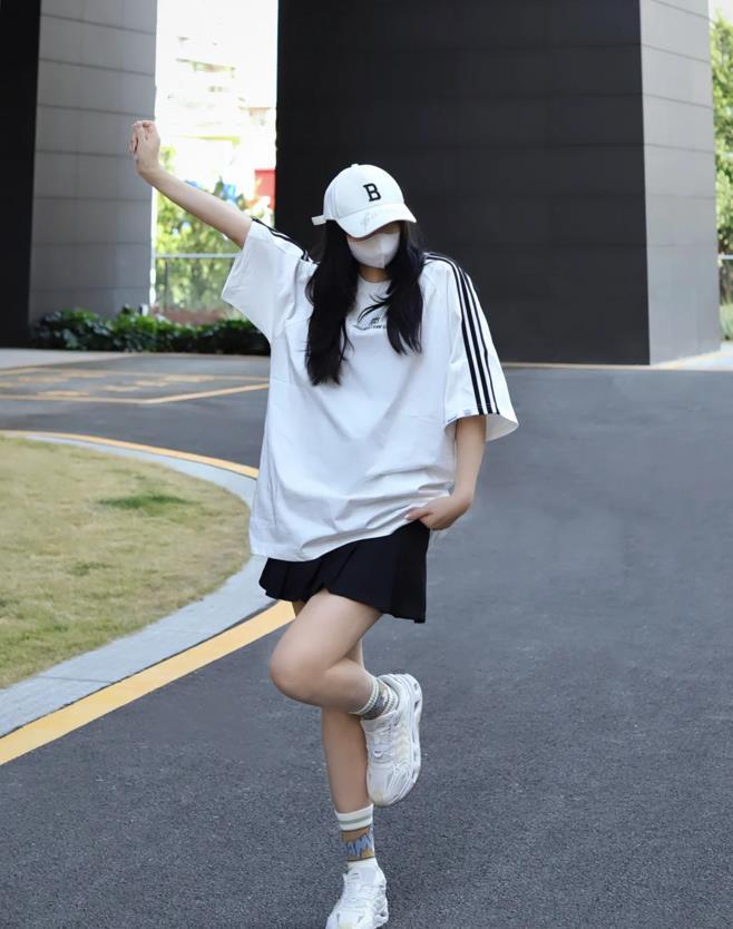 黑白配的穿搭,就是最時髦耐看的,永不過時的組合,寬鬆長白色t恤,對身材有着極佳的包容性,可太顯瘦和藏肉了。選擇黑色短裙來配,上長下短的穿法,可以很好優化整個身材比例,腳下踩着一雙白色運動鞋,元氣少女範十足。