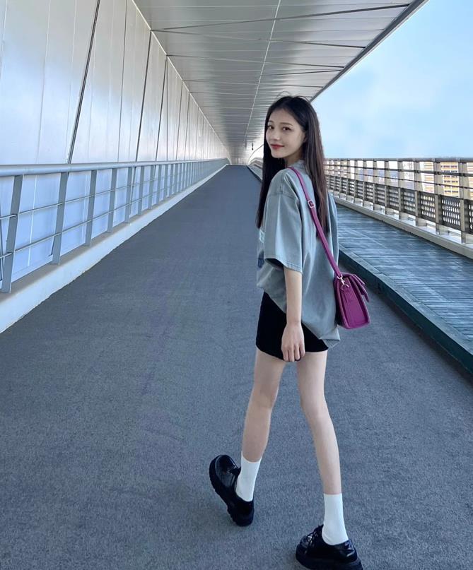 150小個子女生這樣穿看起來也太顯高了,可甜可酷的一身,夏天這樣穿也太舒服了,灰色寬鬆的短袖t恤,對身材有着極佳的包容性,下身配一條黑色短褲,與腳下踩着的黑色鞋子進行了呼應,很顯腿長和顯高挑。