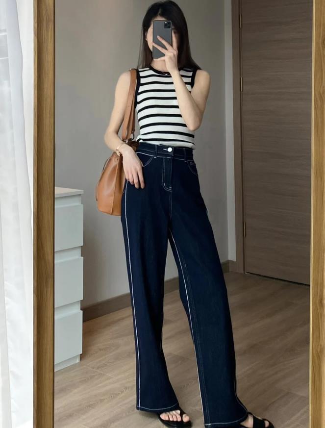 條紋背心+牛仔闊腿褲,將腰線提高起來後,就很好優化了整個身材比例,上短下長的組合,可太顯瘦和顯腿長了。褲子的垂墜感也是極佳的,能很好拉長腿部線條,視覺上非常顯瘦。