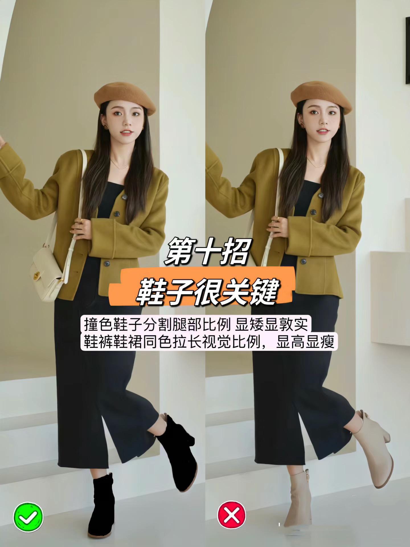 可以選擇與下裝同色的鞋子,穿黑色的半身裙、或者高腰褲,就搭配黑色鞋子,不要去配淺色的鞋子。