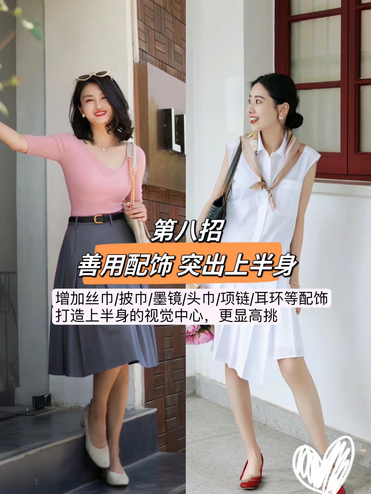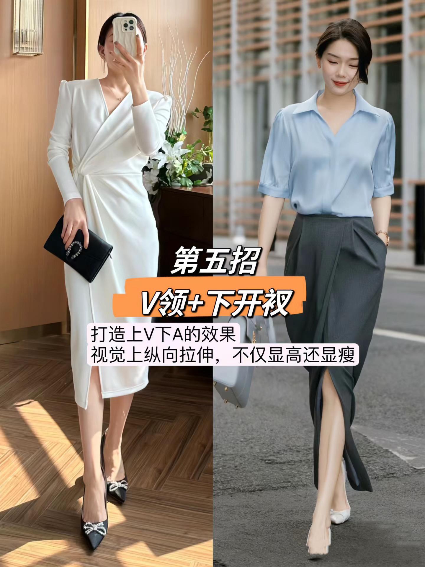 之前給大家分享過,這一種視覺錯覺的顯高方式。平時利用率還是蠻高的,比如我們選擇V領+下襬開叉的連衣裙,就很洋氣顯高。