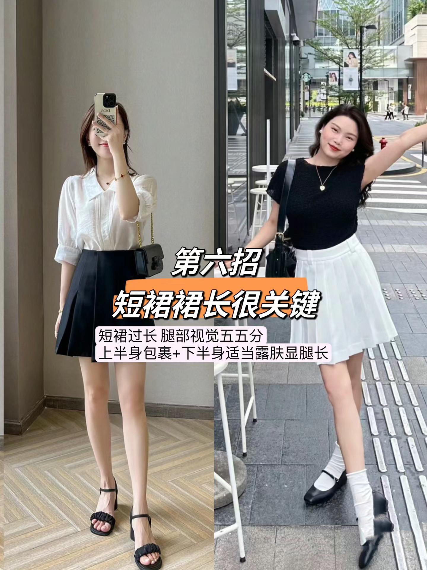 到膝蓋上方附近的短裙,穿起來很容易顯得拖沓,更容易表現出視覺上的五五分。而長度到大腿根的話,則會顯得腿型更修長一點。