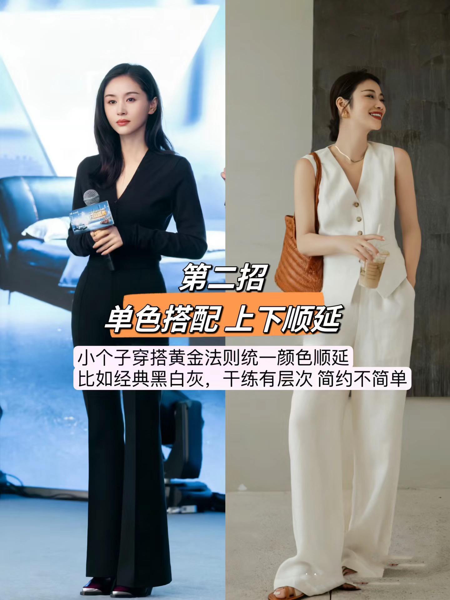 小個子女生想要顯高,色彩順延也是必學的計較。就是上下同色、或者鄰近色的組合。比如一身黑色套裝,幹練酷颯顯高又有氣場。