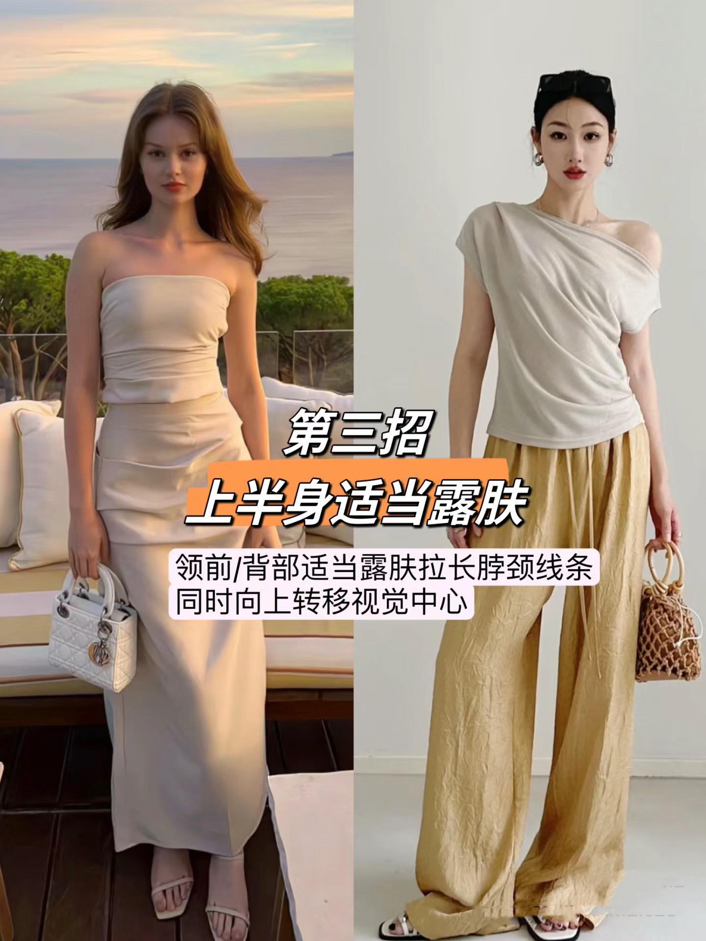 上身適當的露膚,可以抬高視覺重心,增強輕盈度。不管是領口還是背部,都可以選擇少許露膚的方式,來轉移視覺中心營造顯高效果。
