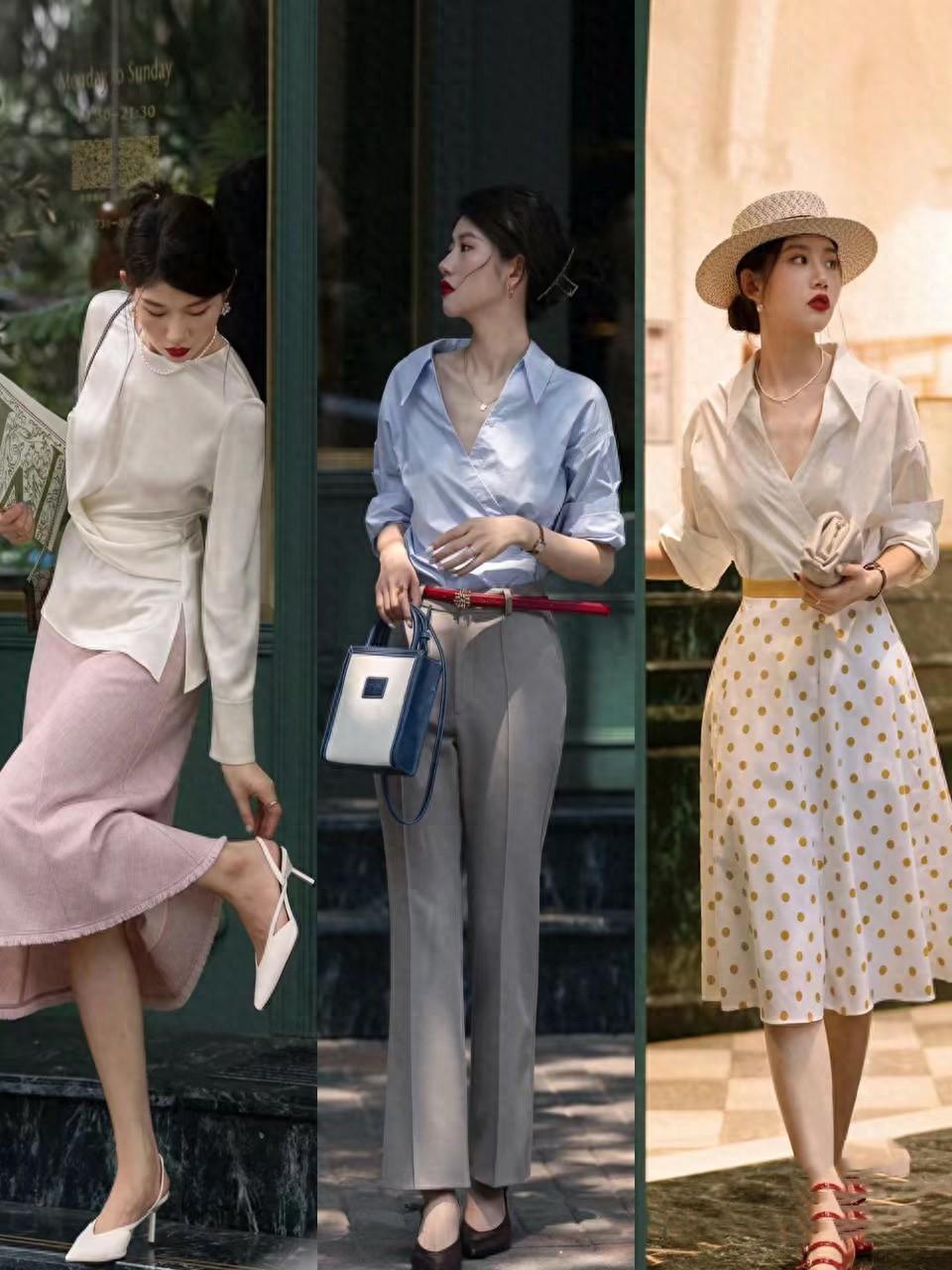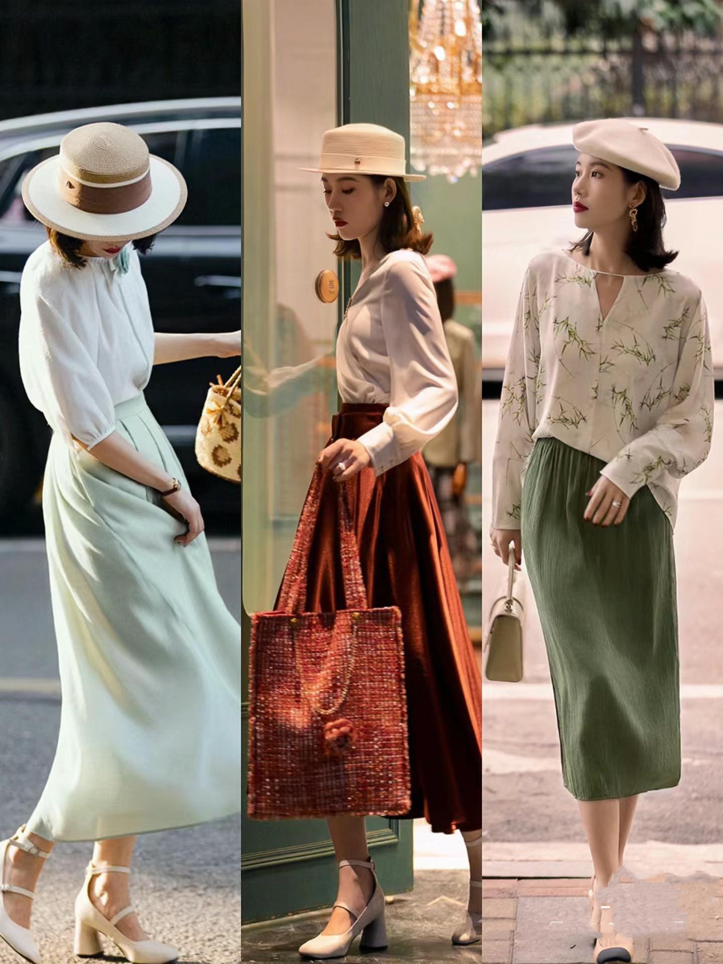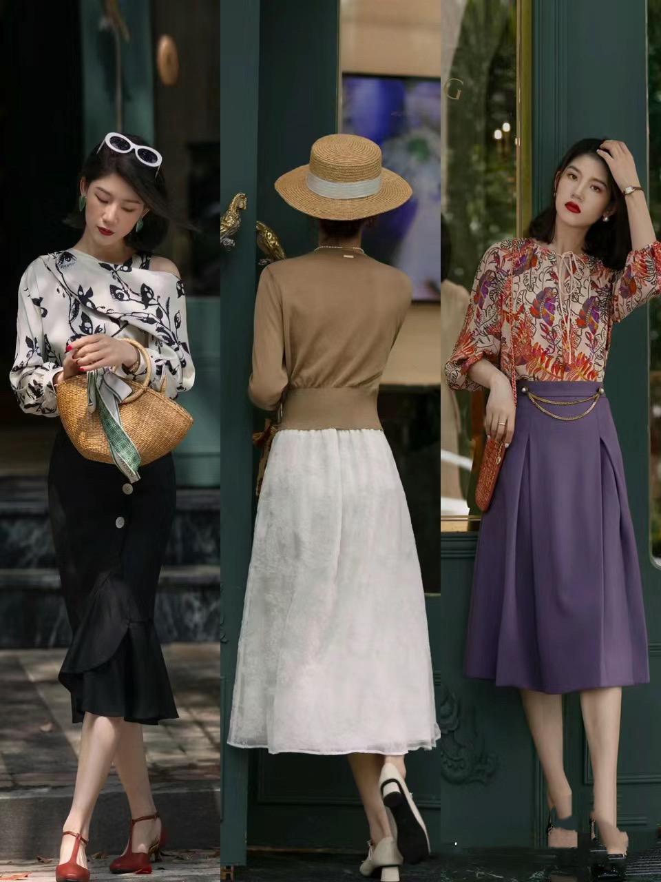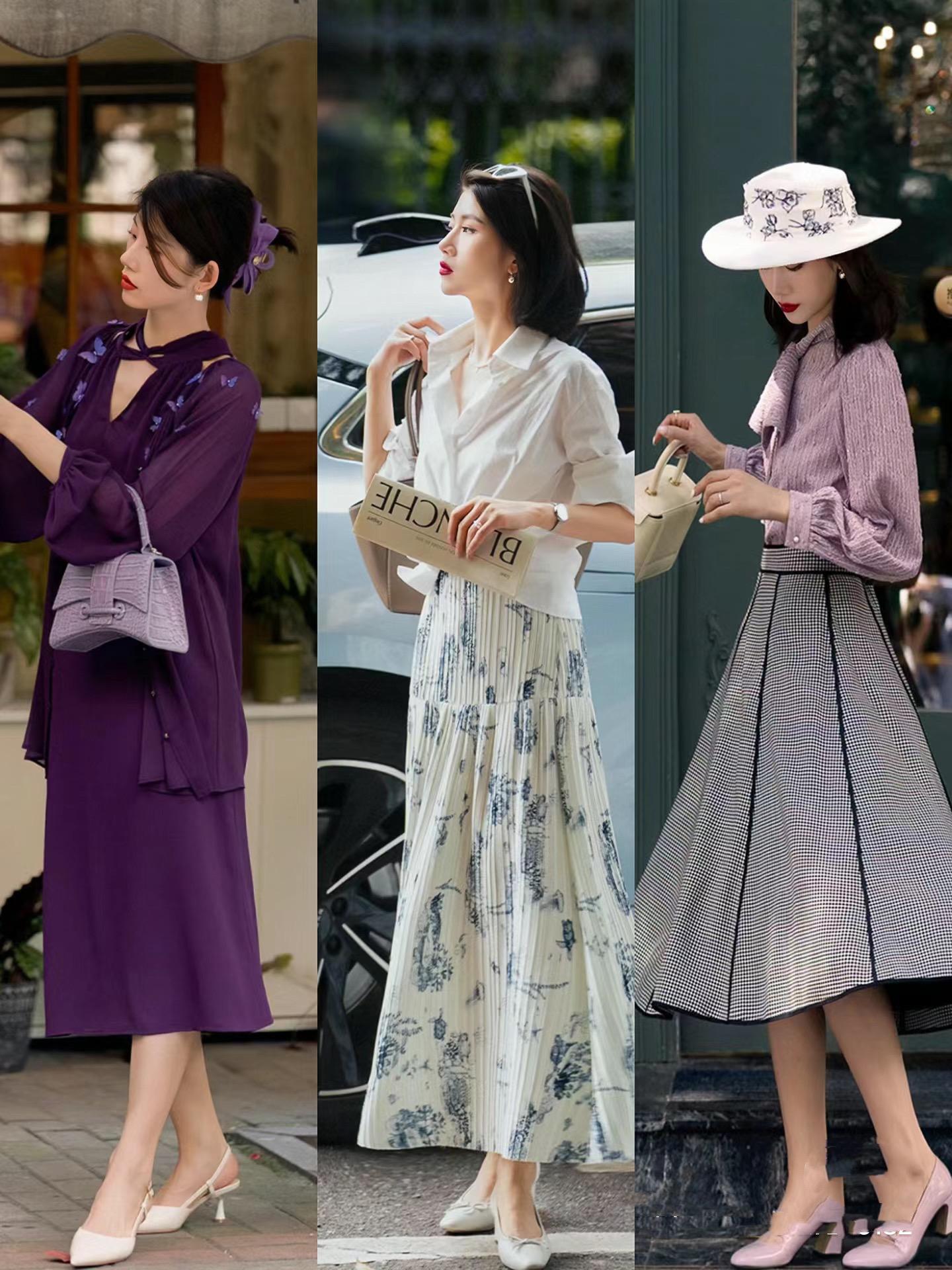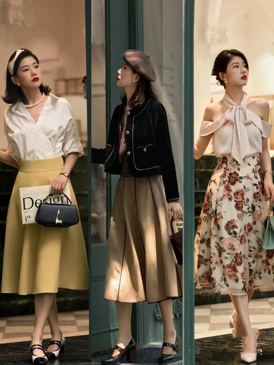 貴氣感穿搭,不只考驗衣着、更考驗搭配。白襯衫+赫本裙屬於端莊大方的組合,對於梨形身材、腰粗胯寬的人羣也很友好。
