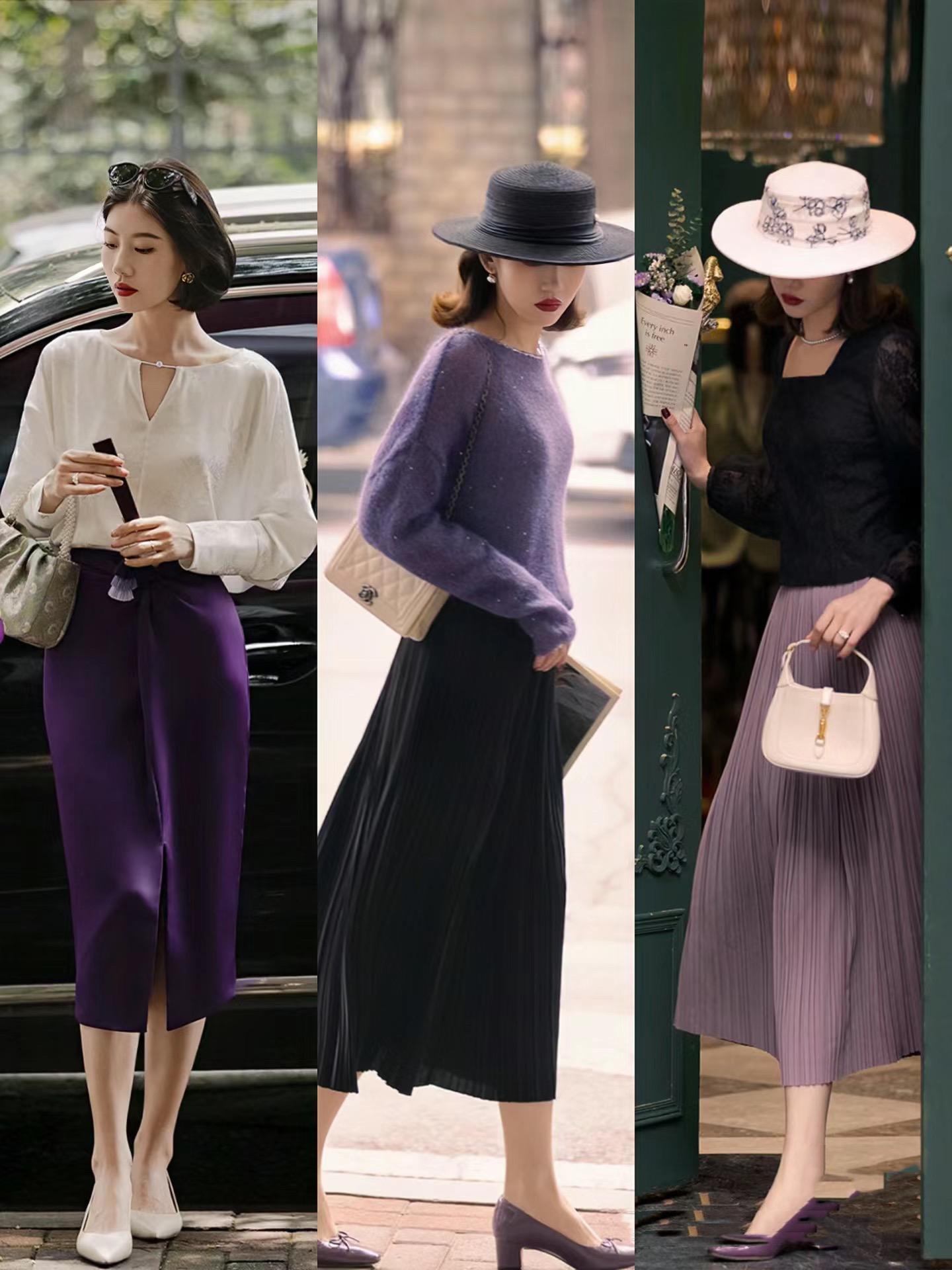 時髦貴氣的穿搭,更講究配色。儘量避開透明度高的顏色,用色彩濃郁的單品提升氣場、營造時尚氛圍,比如黑色襯衫+紫色百褶裙,就浪漫顯貴。
