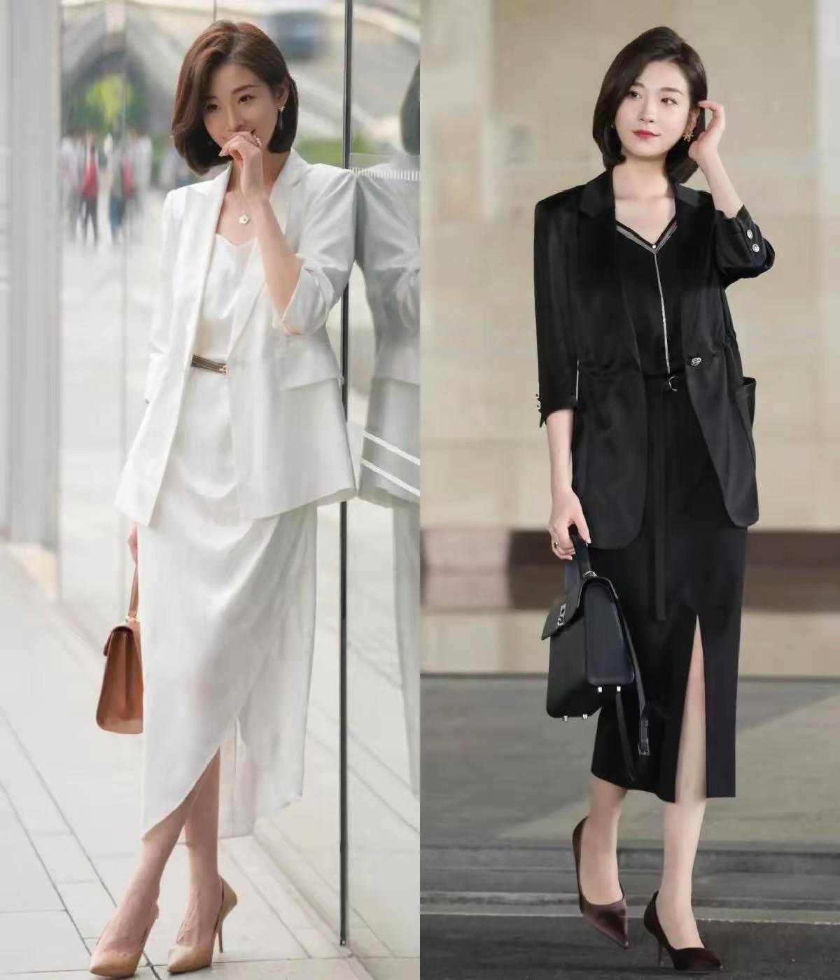 帶着幾分小性感的白色吊帶裙,搭一件同色西服外套,就演繹出職場女性的幹練與大方。