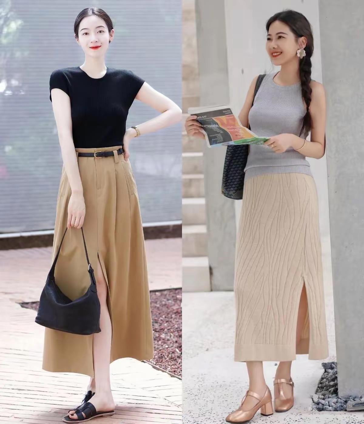 不含蓄、不張揚,以無袖背心配個性的開叉半身裙,簡潔耐看。