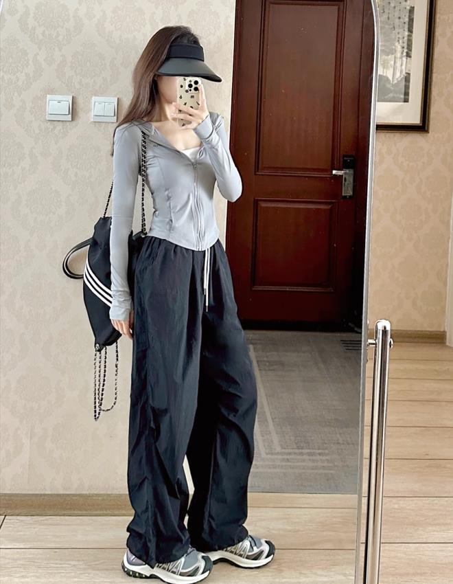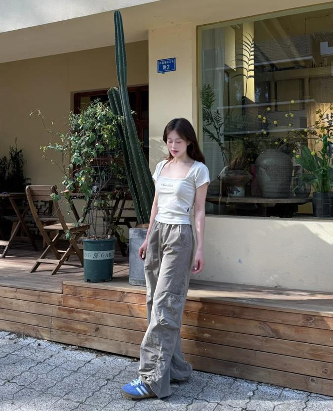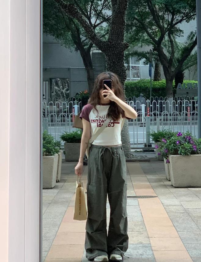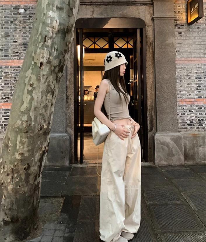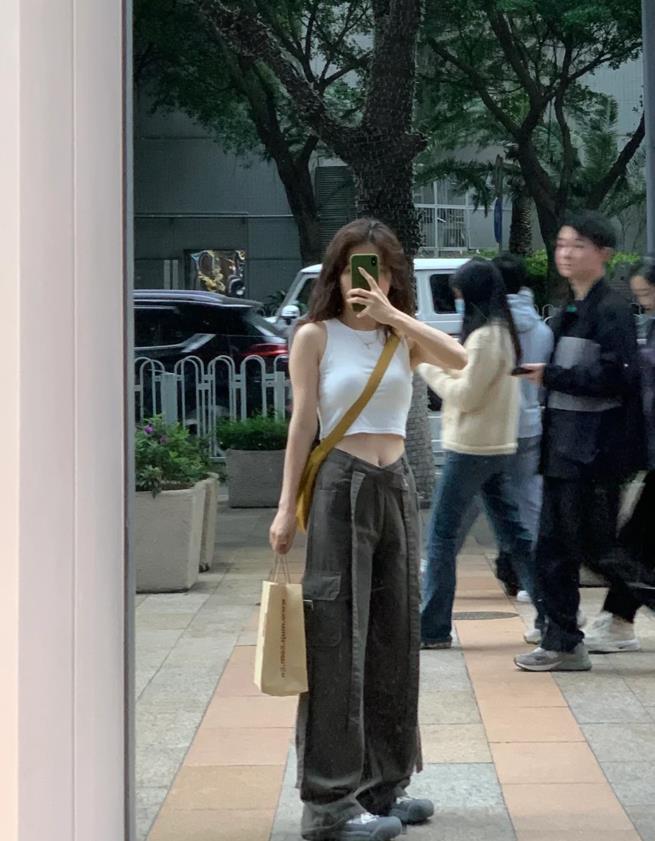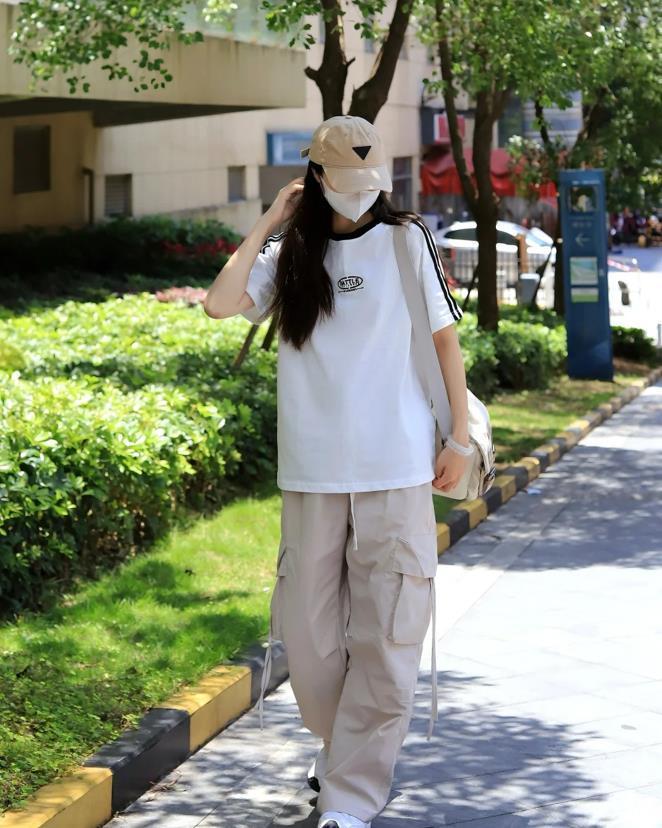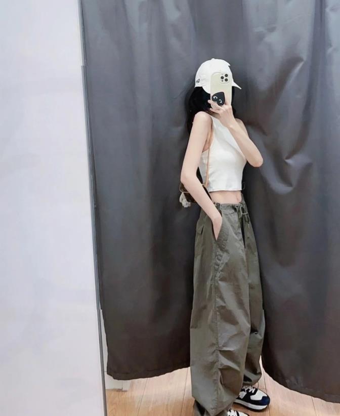 今年工裝褲實在是太火了,有些偏美式風格的工裝褲,版型是寬鬆的,可以巧妙遮掩住身上的肉肉,顯瘦的同時,又可以把腿部襯托得很筆直。褲腳是抽繩設計的,可以兩穿,上衣搭配一件白色短款背心,上緊下松,很好優化整個身材比例,顯瘦極了。