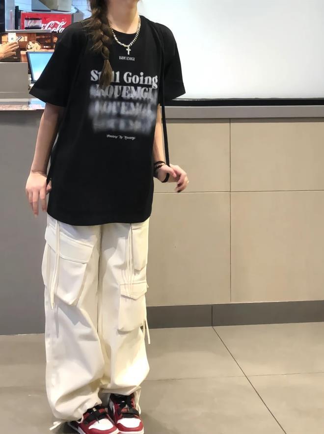 黑白配果然是超合適的一套組合,經典耐搭又時髦,黑色短袖t恤和白色工裝褲組合一起,太絕了,寬鬆的褲子,完全不挑人的,什麼腿型的都可以輕鬆駕馭。頗顯少年感的穿法。