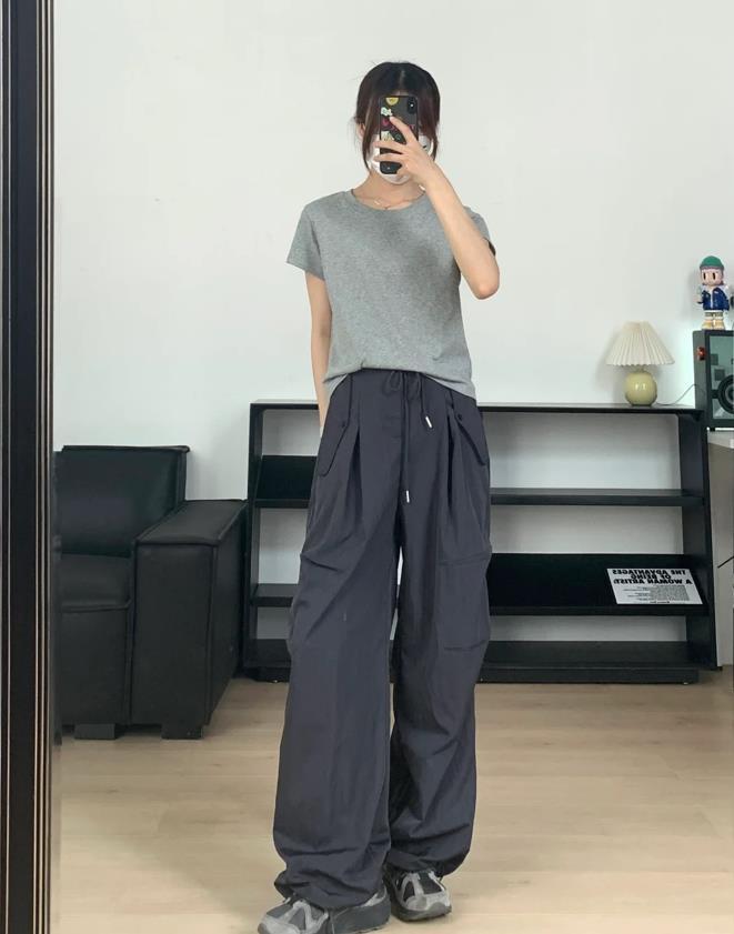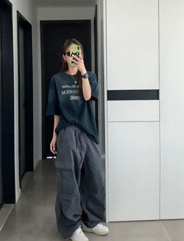 當你穿膩了闊腿褲後,這個夏天說什麼也要爲自己入手一條工裝褲,高級灰色的工裝褲,不僅百搭時髦還能讓你穿出舒適感。寬鬆的褲型,上身效果真的非常棒的,與基礎款淺色短袖t恤來配,同色又不同色調的組合,很顯層次感。