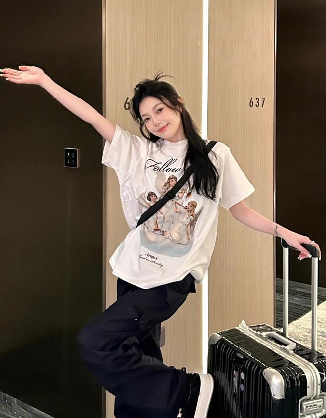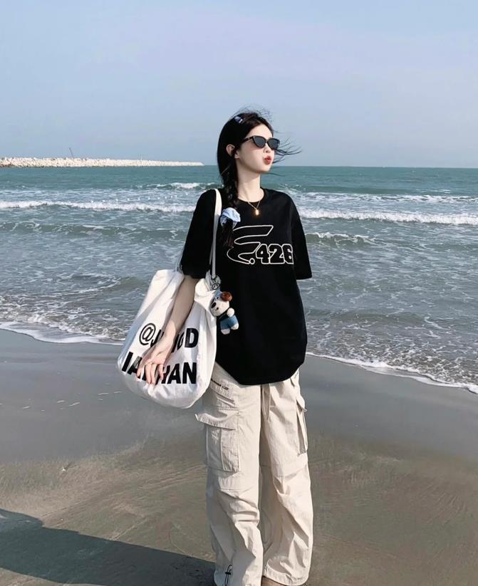 夏天就是不能沒有一件收腰的t恤,大方領的設計,露出精緻的鎖骨,既把脖子線條給拉長了,又很清爽涼快。與工裝褲相配,瞬間多了幾分帥氣感,鞋子的話配上一雙運動鞋即可,適合出遊或者是逛街的一套。