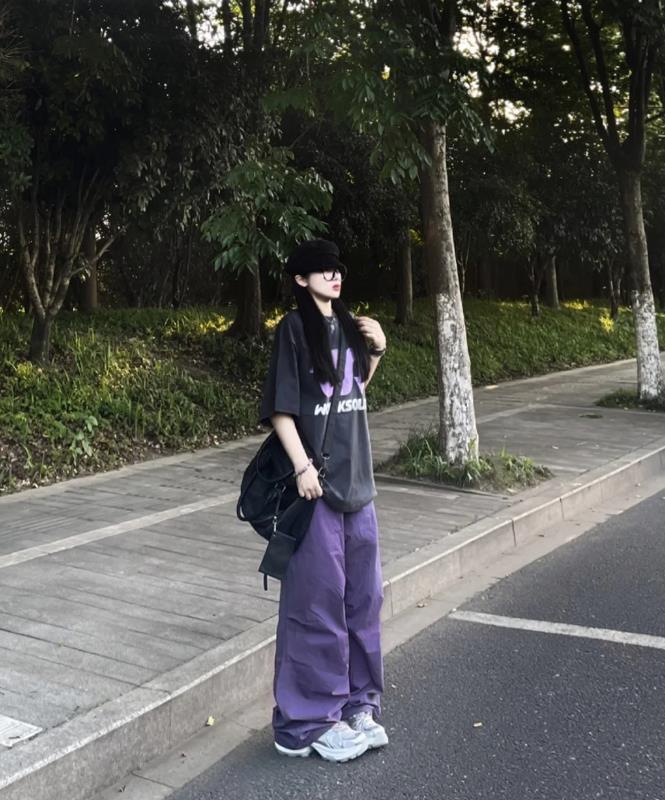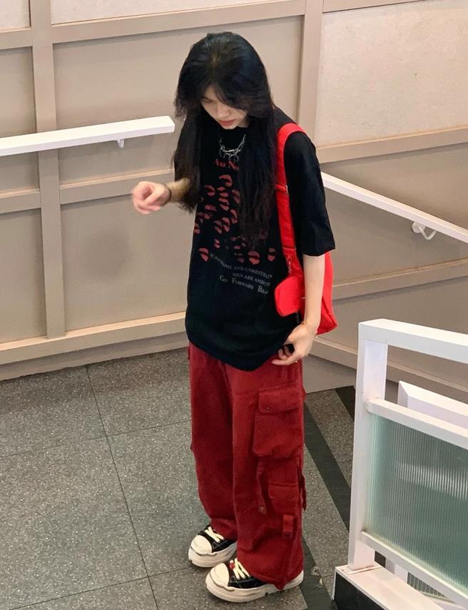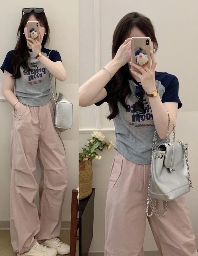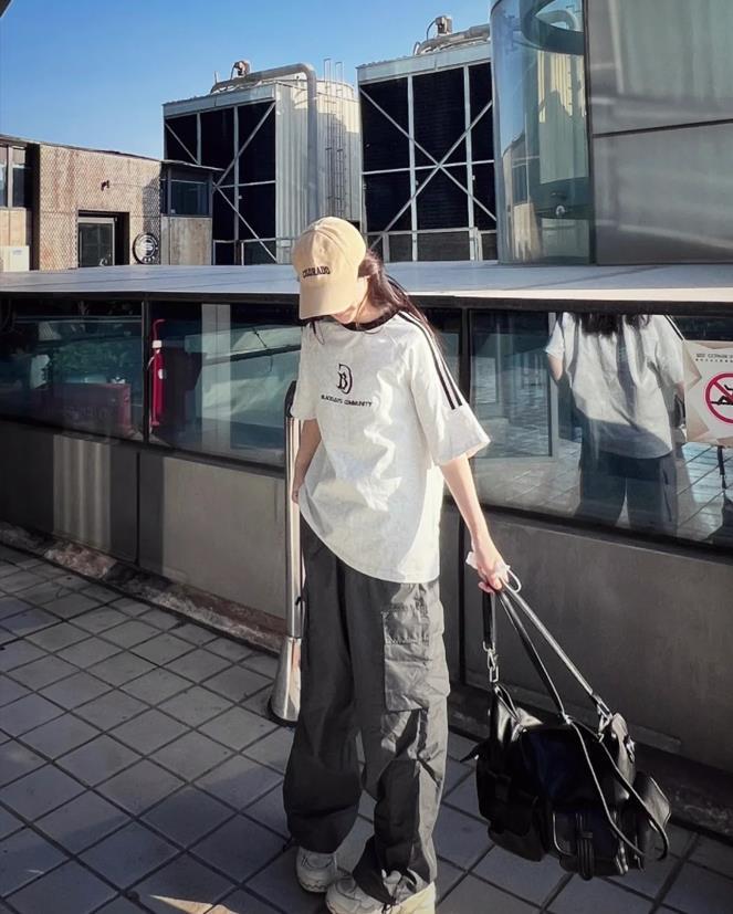 撞色短袖t恤和粉色工裝褲的搭配,看起來也太酷了,低飽和度的粉色,完全不會讓人舉得甜膩膩的,反而展現出一種高級感。上短下長的組合,很好優化整個身材比例,顯腿長又能打造出高挑感。