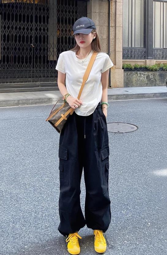 夏日穿搭的盡頭就是極簡風,白色的簡約短袖t恤,與黑色高腰束腳工裝褲相配,穿在身上高級感滿滿,黑白配色的組合,完全不挑人,也不會讓人看膩。不管是日常出行,還是上班都很合適,腳下踩着一雙黃色運動鞋,輕鬆點亮整個造型。