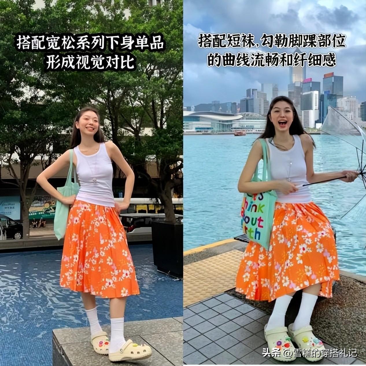 露腳後跟的鞋子,它本身在視覺上的襯托性上就能夠將腳踝的部位襯托得很纖細,以此來以小見大地營造整個腿型的纖細感。所以如果你本身的腿型狀態是屬於比較粗壯的類型,那麼建議大家就可以直接搭配一些百褶裙或者是寬鬆的a字裙,以此來形成對比最顯瘦了。