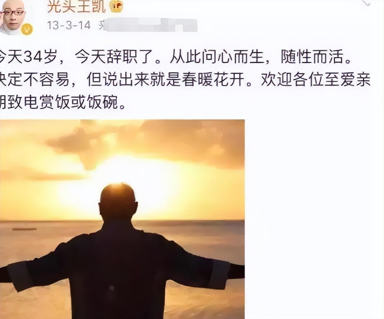 2013年,34歲的王凱官宣從央視辭職,在官宣內容中他是這樣說的:從此問心而生,隨性而活。決定不容易,但說出來就是春暖花開。
