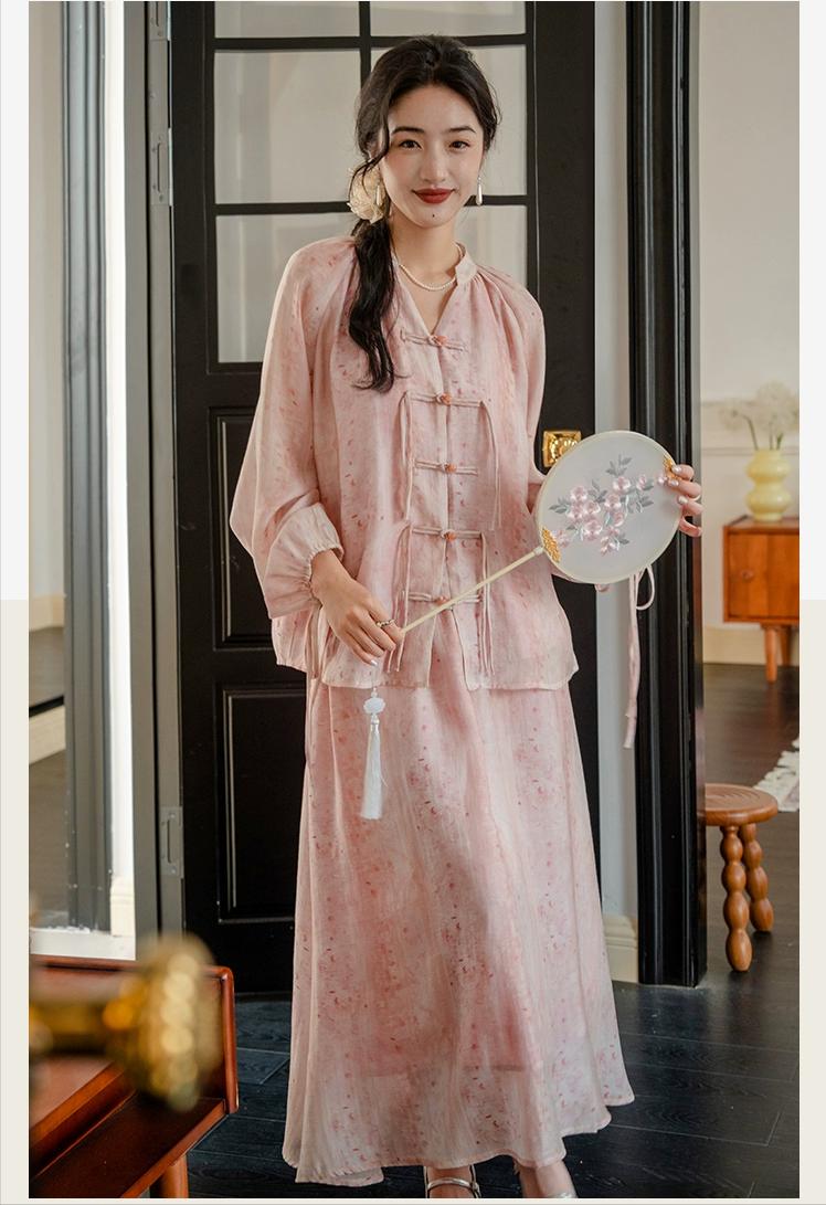 選淡雅色套裝,如灰藍、米白,簡約中帶小立領、中式扣,搭配同色繫腰帶,簡約大氣。