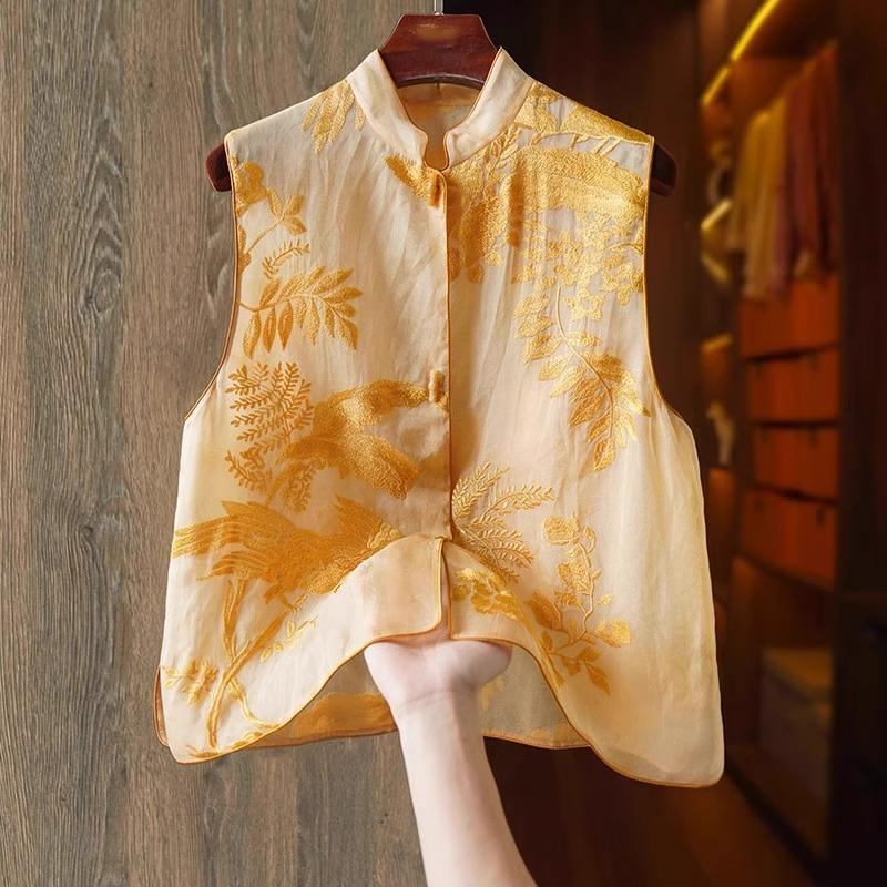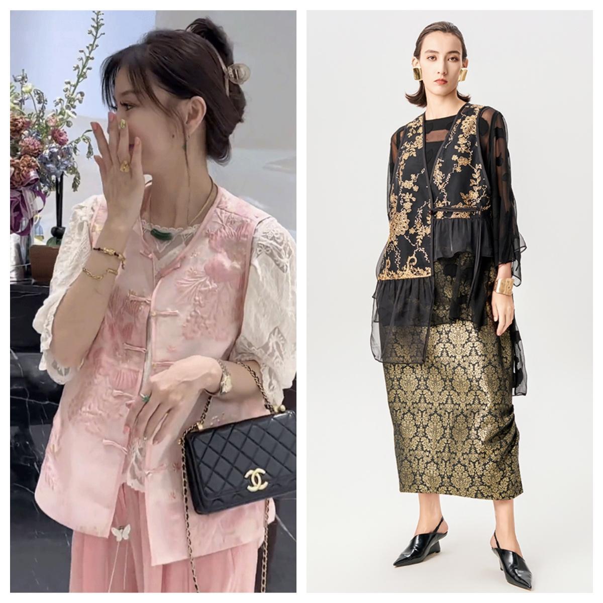 選擇簡約服飾,如白襯衫、黑色褲裝上加一件精緻刺繡外套,細節處展現細膩東方美,不張揚。例如雙層面料拼接套裝:外層薄紗或輕透質如絲,內層實,隱約露出內搭,展現層次感,領、袖口、下襬等細節拼接,現代中帶傳統美。