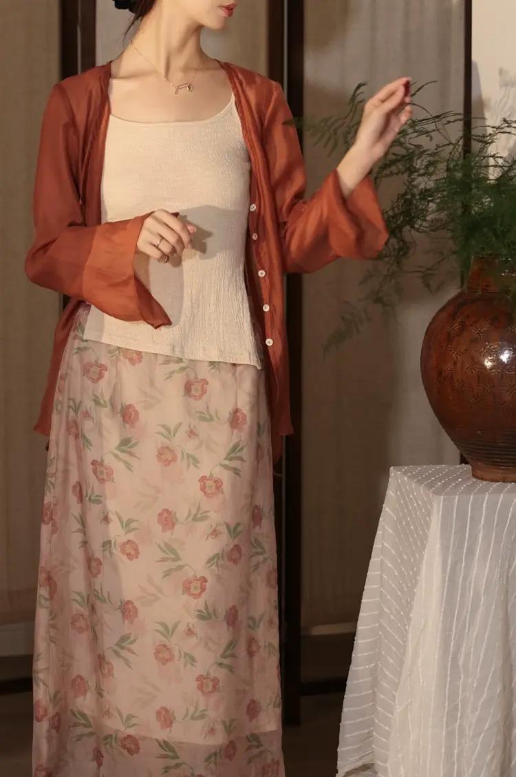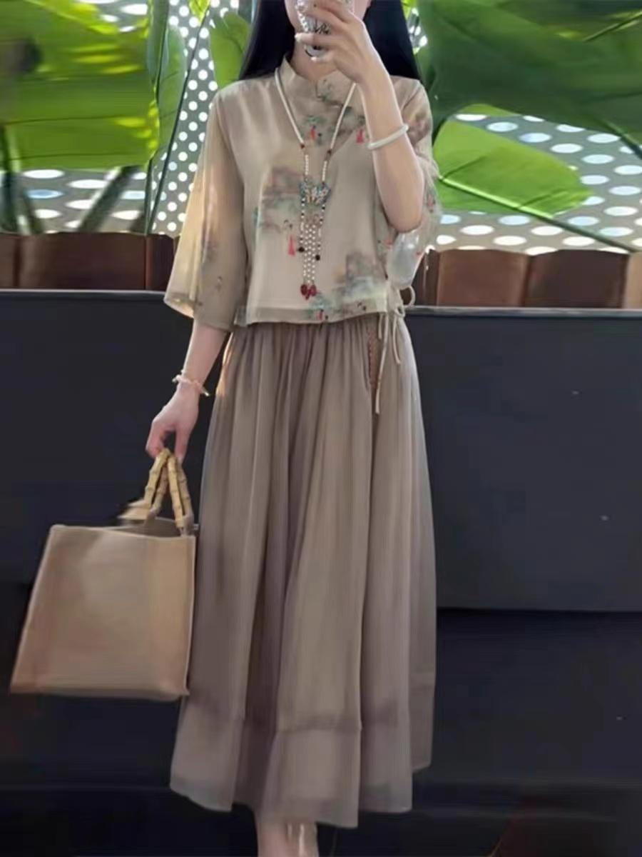 水墨畫印花襯衫:以中國山水、花鳥語花鳥、水墨畫爲圖案,佈滿載於襯衫,藝術氣息濃厚,搭配素色褲或半身裙,盡顯文化底蘊。
