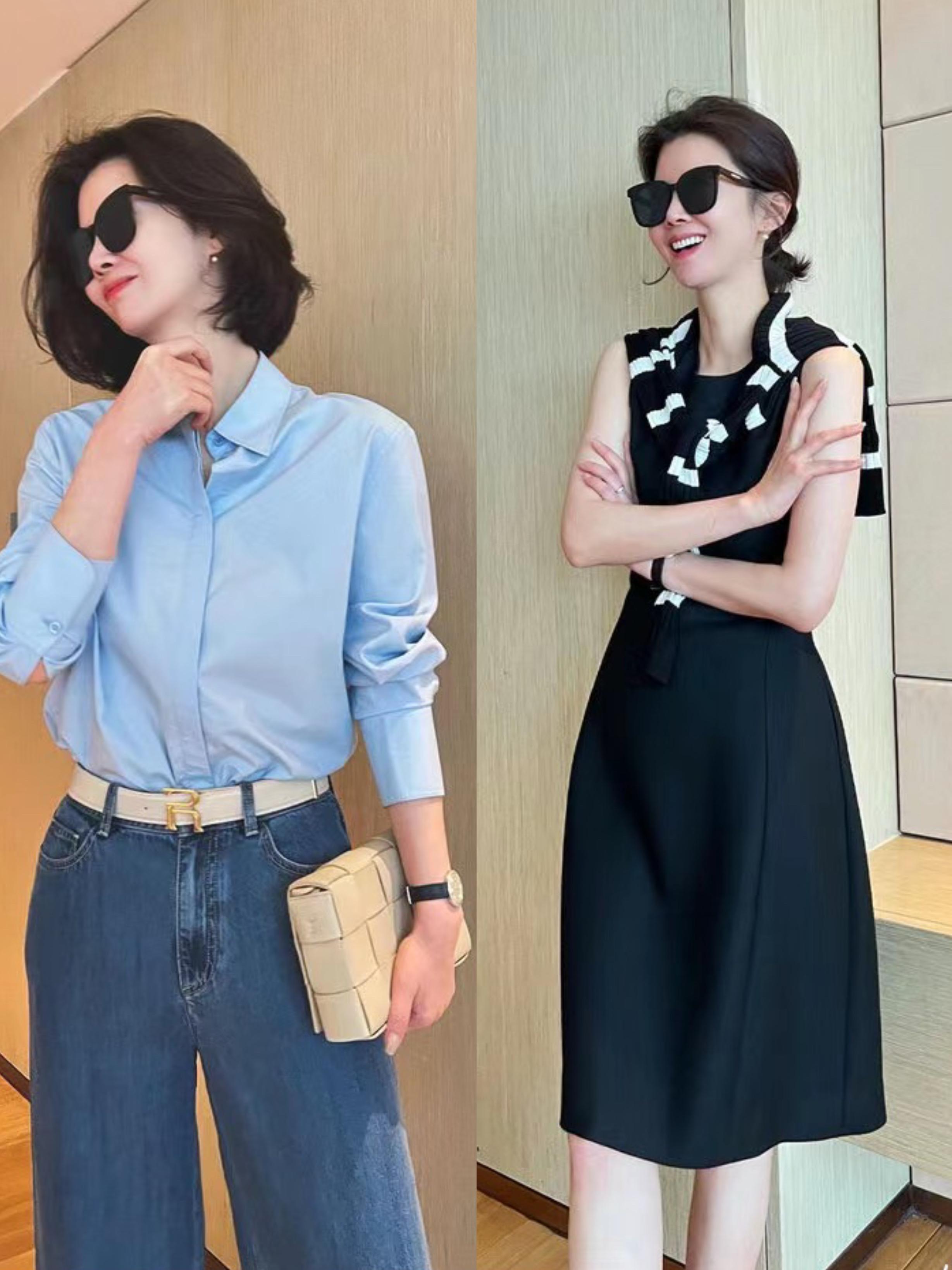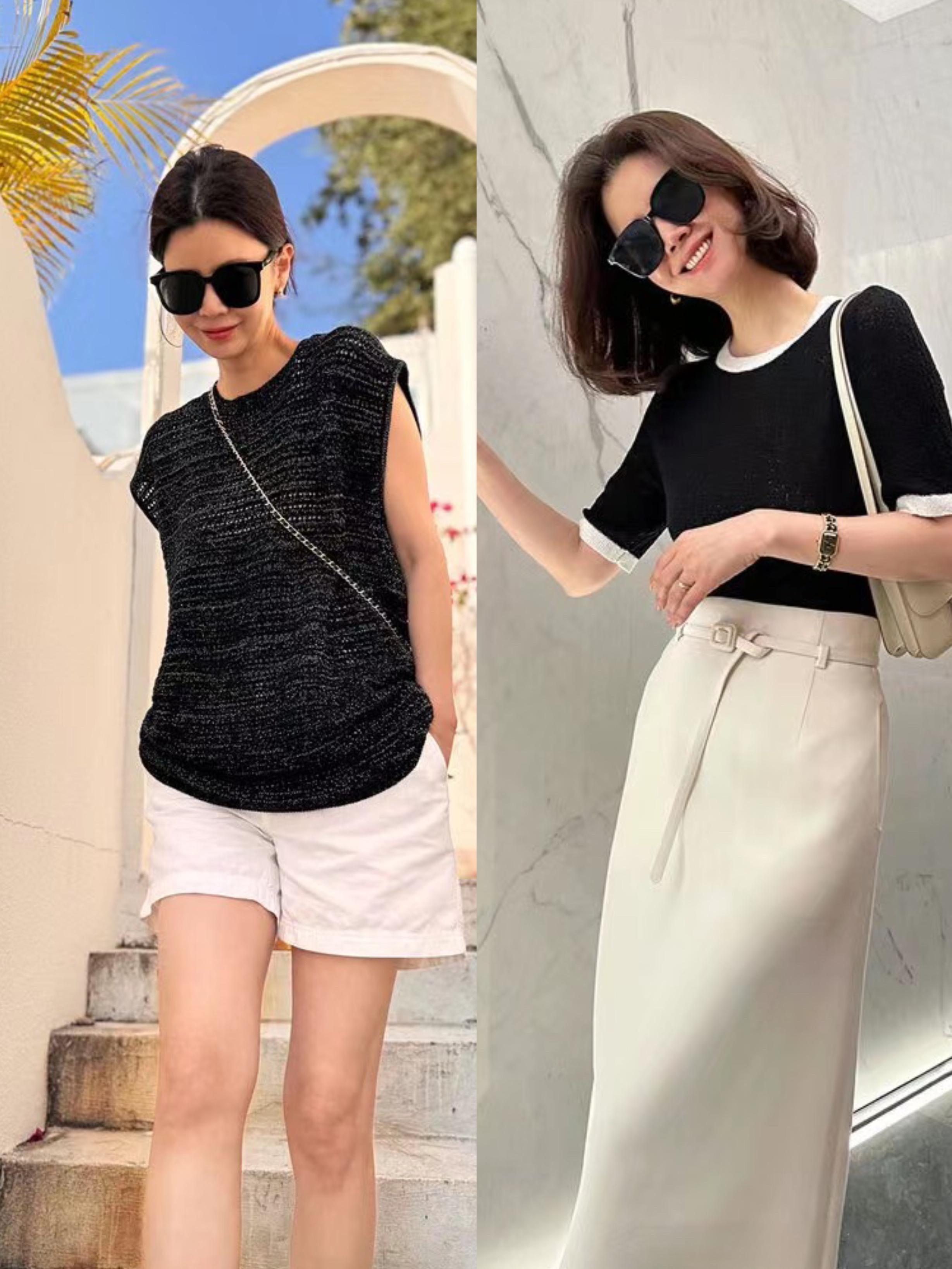 穿級了常規的T恤,還可以選擇小飛袖的T恤,或者polo領的上衣。40+女生想要高級時尚的美,可以選擇基礎款、但一定要有自己的小心機。