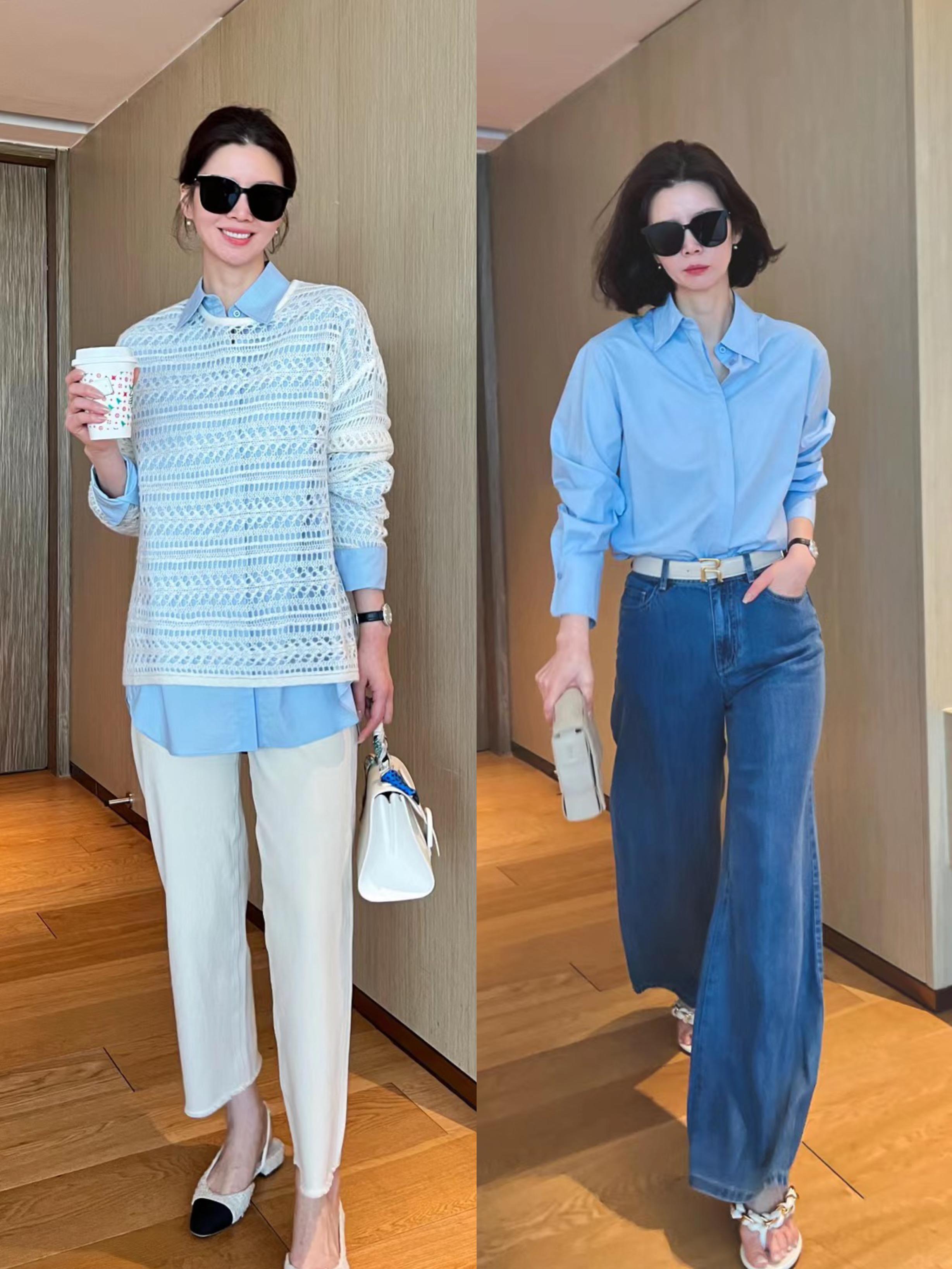 襯衫就不要選擇萬年不變的白色系了,以清爽且耐看的藍色襯衫,融入我們的穿搭中,帶着幾分冷冽也個性酷颯,想要溫柔一點,疊搭蕾絲罩衫時髦還減齡。