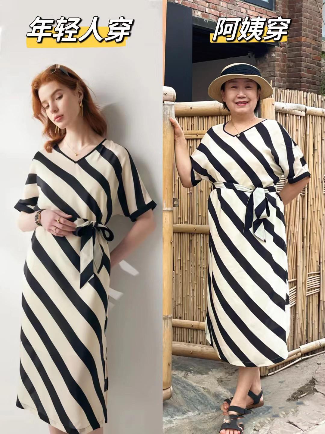 時髦感爆棚的條紋連衣裙,在年輕人身上有一種清冷疏離的美。阿姨120+的體重,穿起來格外富態。