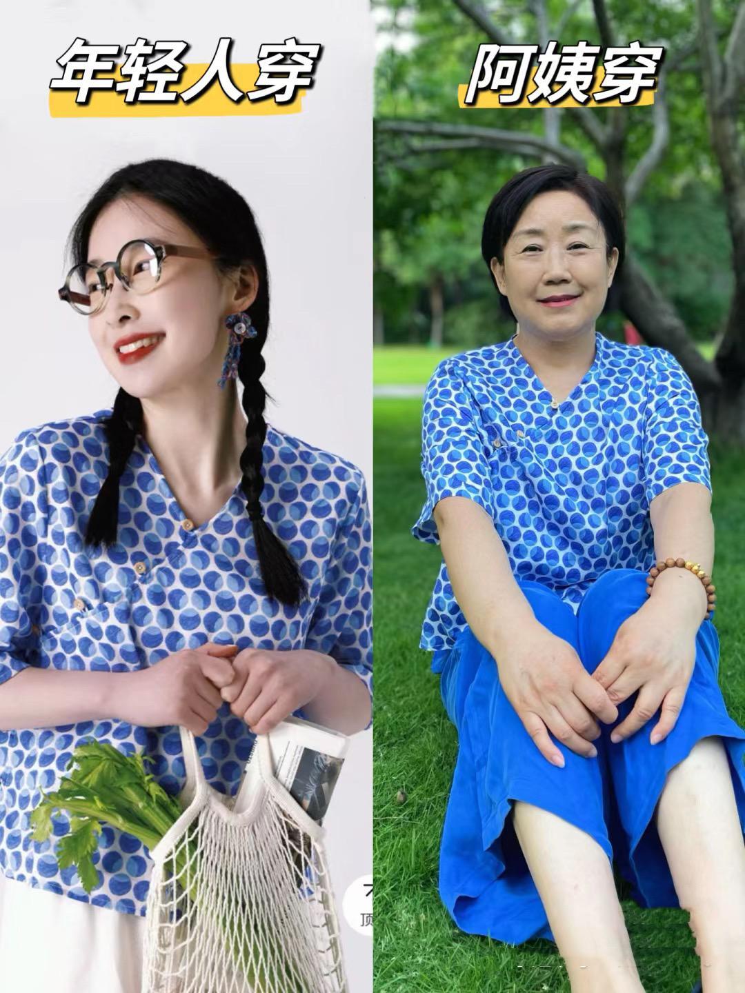 相對於年輕博主的藍白配色,這位60+阿姨選擇了藍色波點上衣+藍色闊腿褲的搭配,大面積的藍色更加醒目、也超級顯白、很是減齡。
