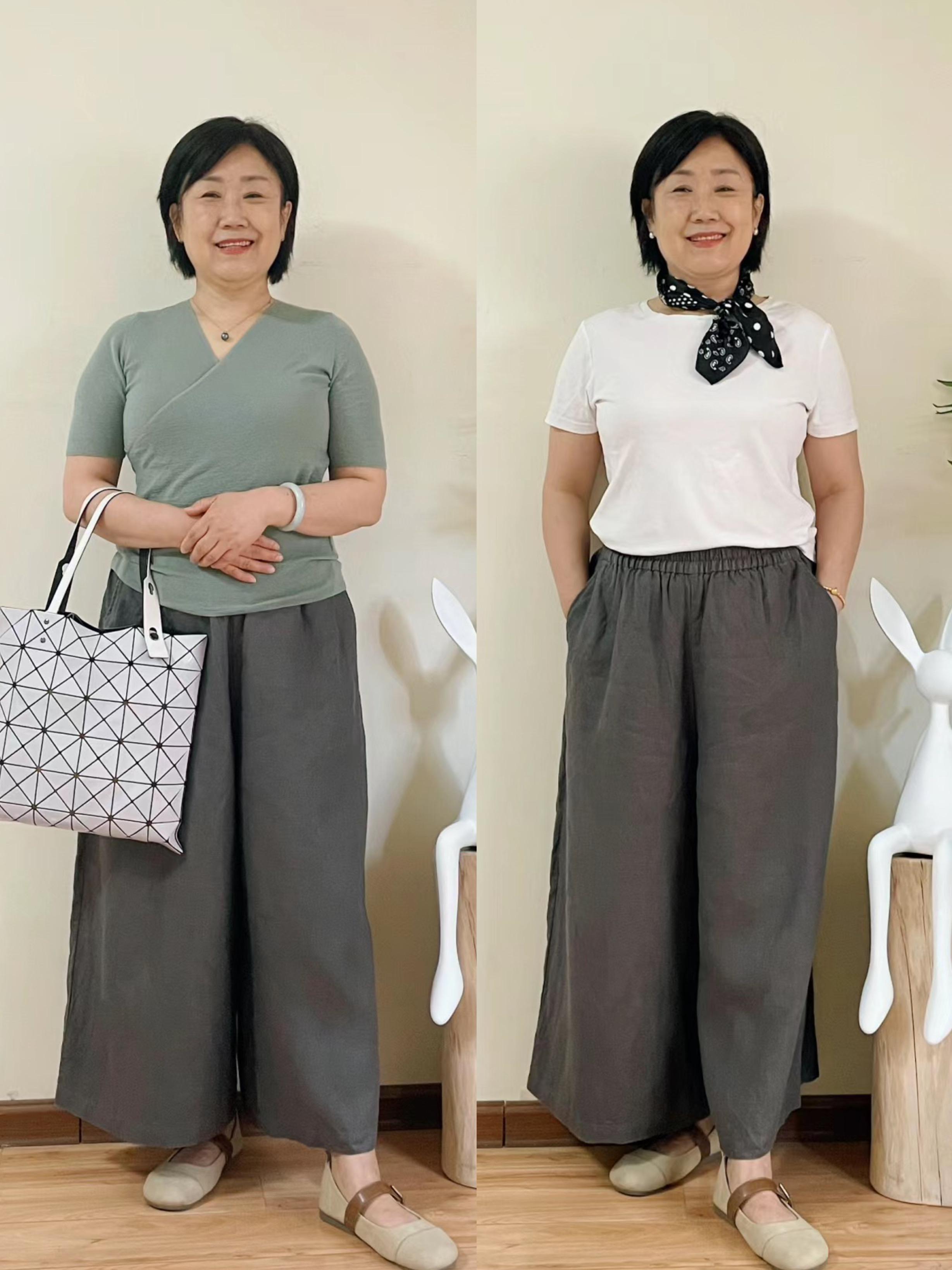 對於60+的阿姨來講,基礎款的T恤簡直就是一大救星。褲筒非常寬鬆、穿上身包容性更強。