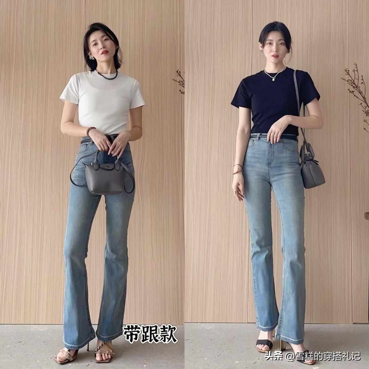 方案1.U型領T恤+牛仔微喇褲+低跟涼鞋