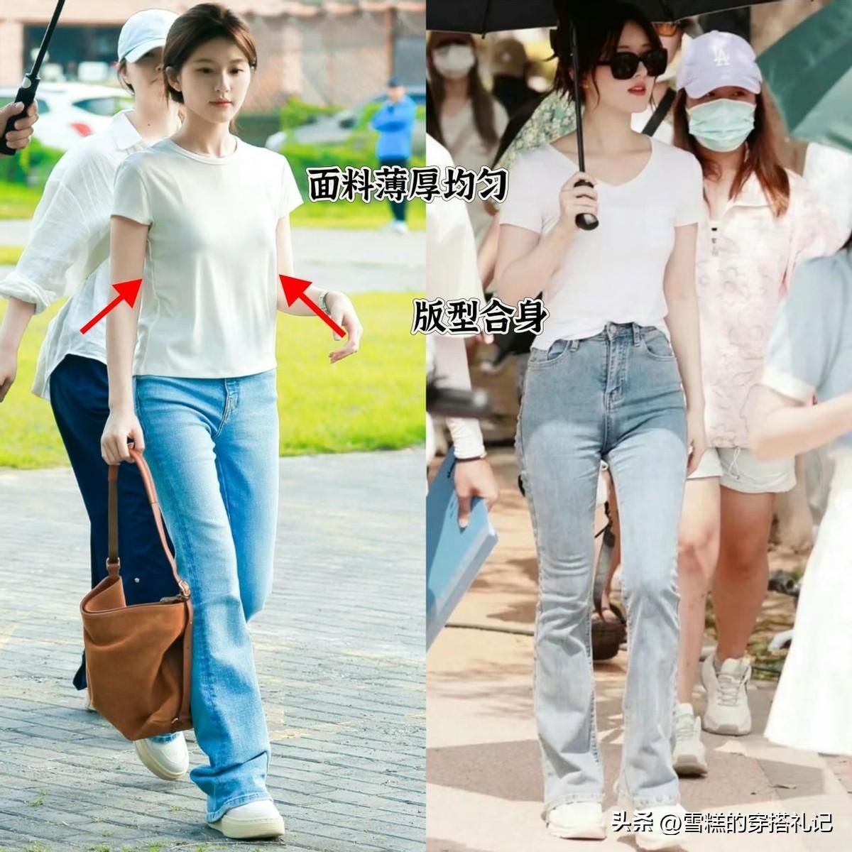 仔細觀察趙露思穿的T恤,就會發現她的T恤肩部,會緊緊貼合在肌膚線條,正肩款式的設計更修飾肩型,能夠輕鬆的隱藏住斜方肌和溜肩的問題。