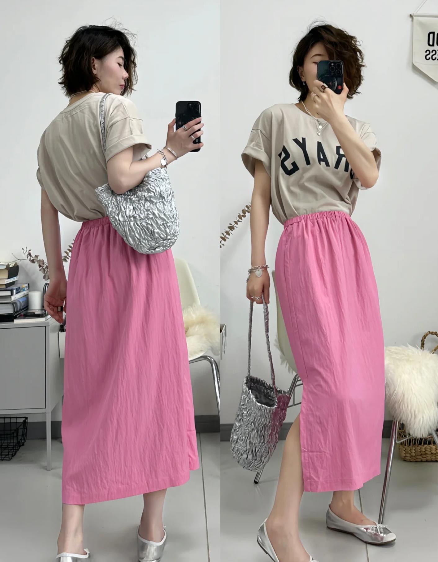或者將色彩的重點放在下半身,玫粉色的半身裙,突出亮色搭配。