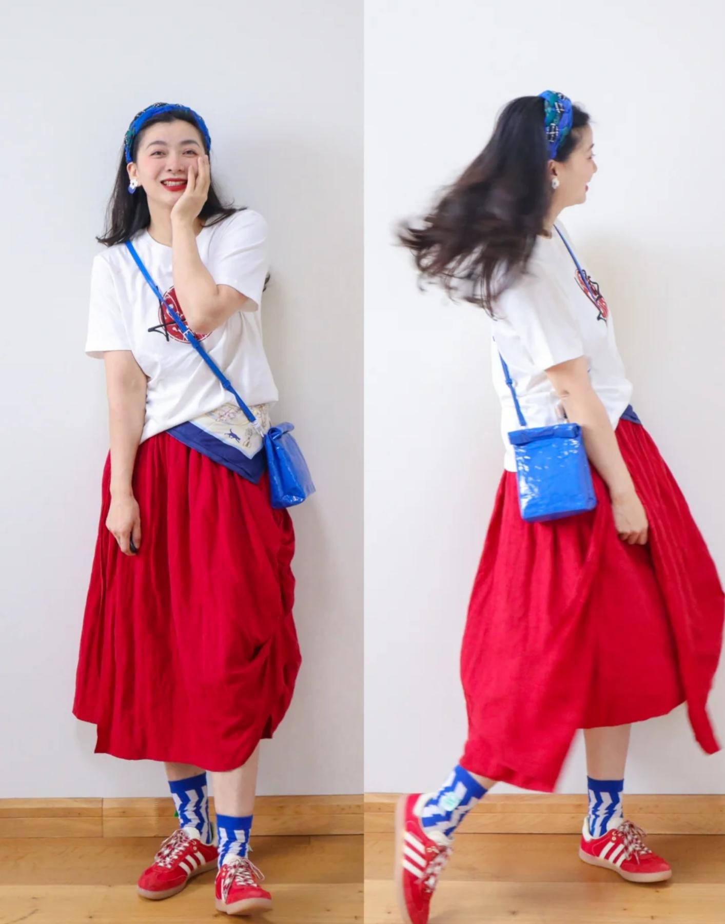 40+女性也可以這樣穿:這三種顏色真的非常顯白,白色基礎款T恤,選擇一條大紅色的半身裙和藍色包包,配上一雙紅色板鞋,適合辦公室穿搭,既職業又有女性魅力。