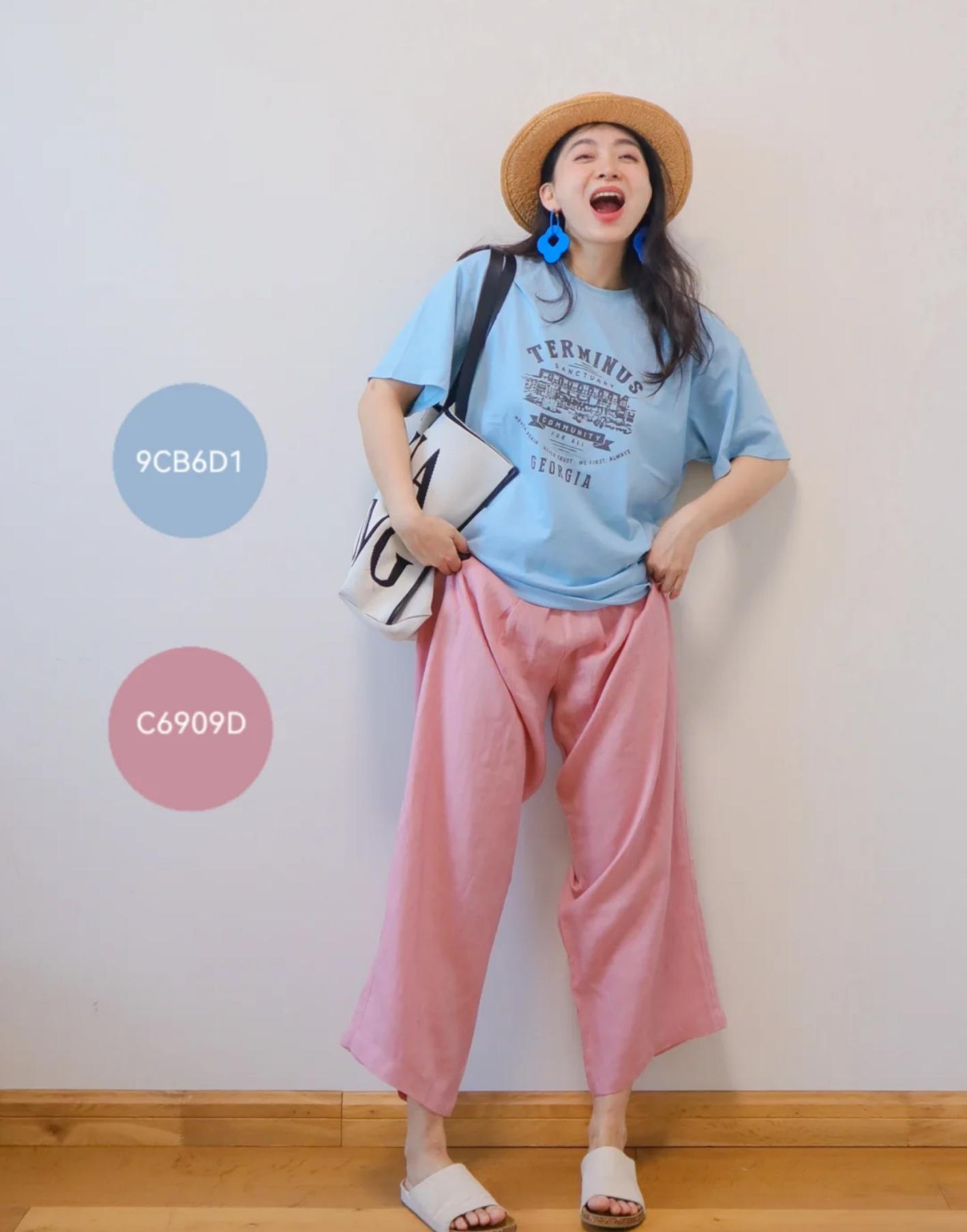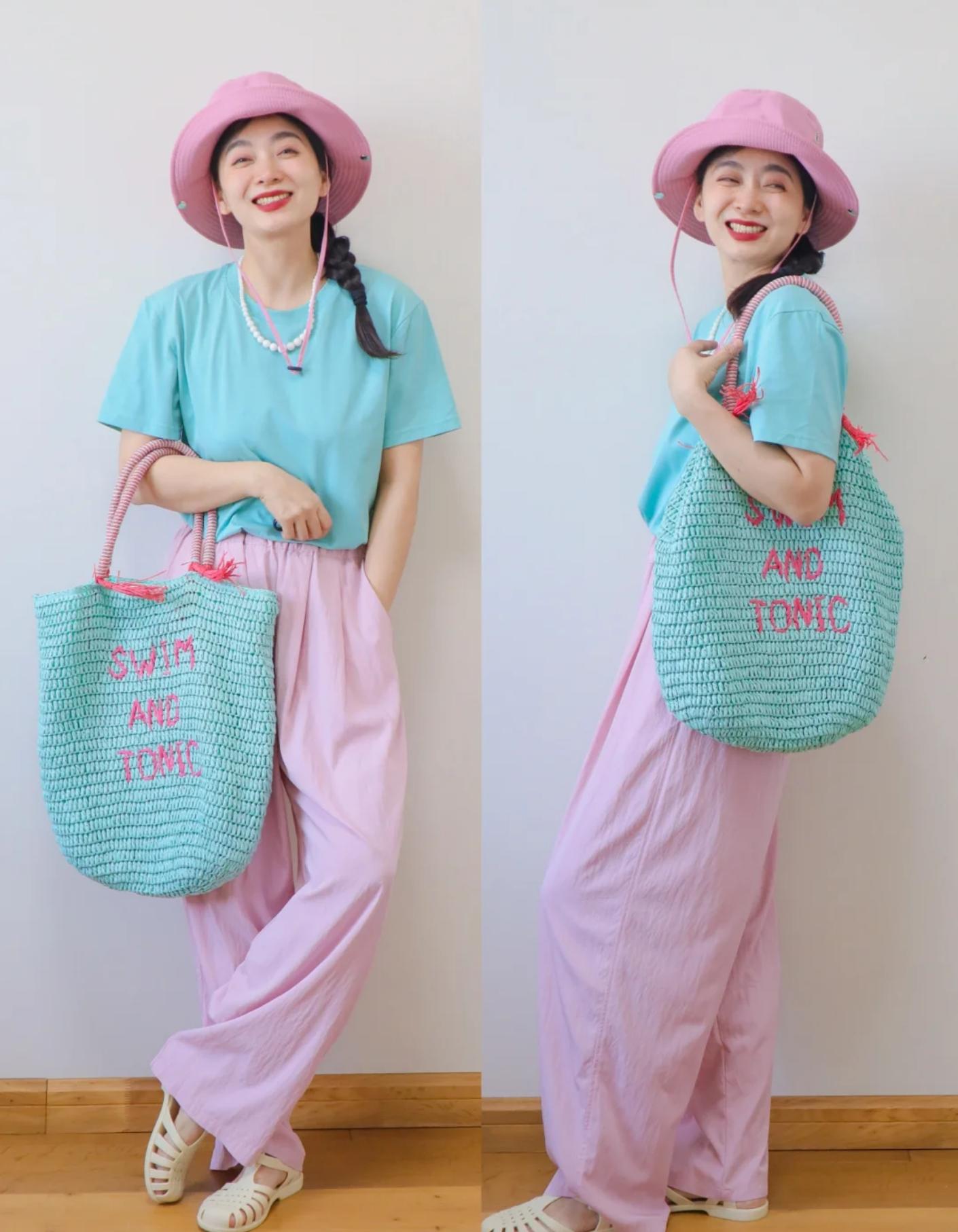 這一套真的非常適合夏日的戶外活動或海邊度假,兩種顏色甜膩不俗, 色彩活潑大方,搭配起來可以營造出溫柔、清新的風格。