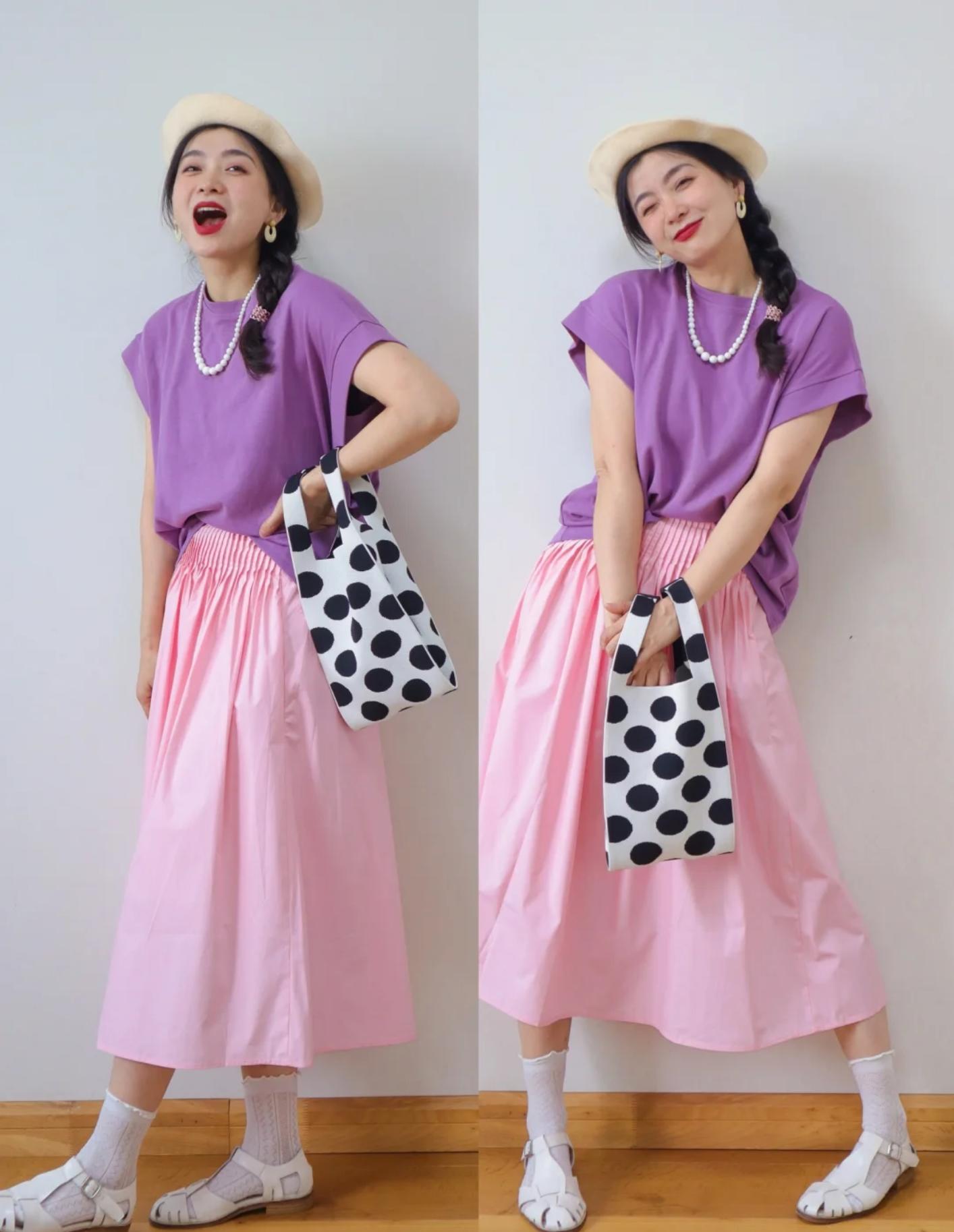 40+女性也可以這樣穿:香芋紫的短袖上衣+玫瑰粉的半身裙,形成視覺上的對比和平衡。白色的珍珠鏈子和襪子頭尾呼應,非常好看。