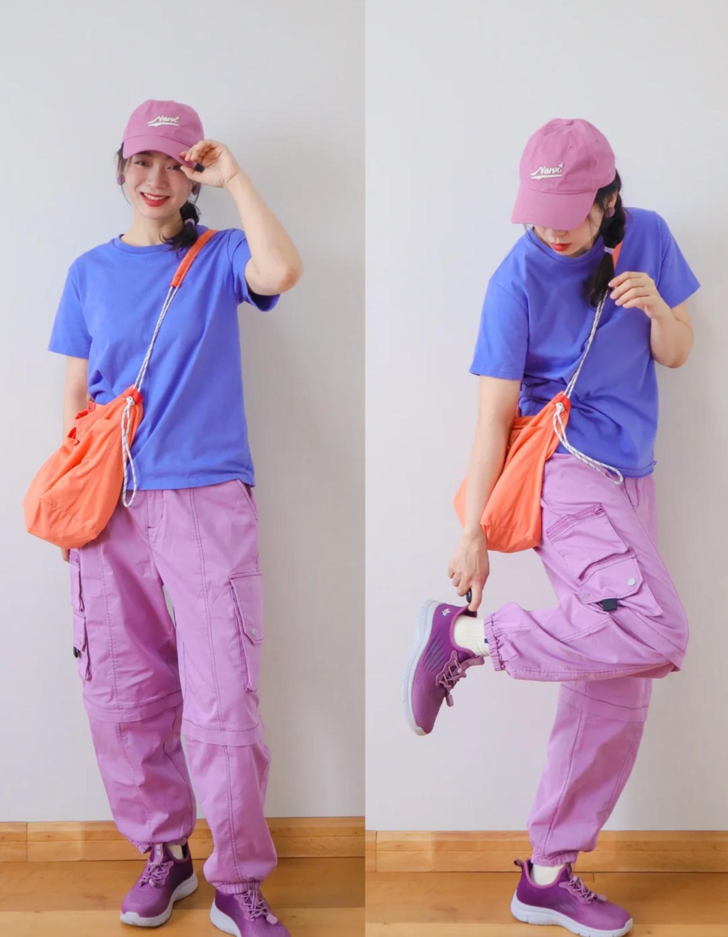 一件藍色簡約T恤搭配紫色工裝褲,非常適合夏天的戶外活動或聚會。打造層次感的同時,也不失女性柔美。