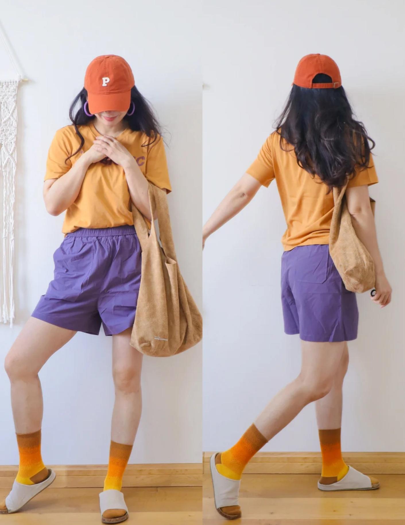40+女性也可以這樣穿:一條合身的淺綠色短袖搭配一件輕薄的寶藍色短褲,搭配藍色多巴胺色系的襪子和藍板鞋,適合休閒或半正式的場合,黃色的帽子起到點睛的作用