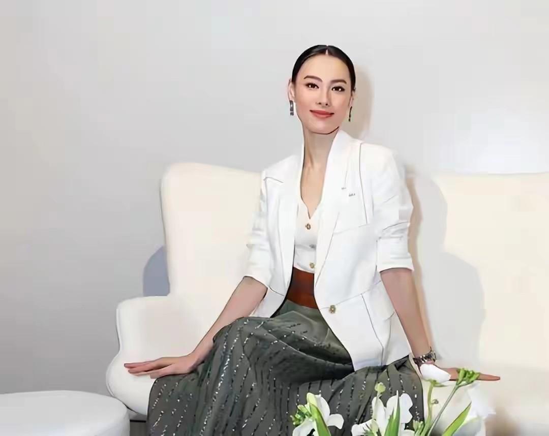 對於白色西服的搭配,梁洛施上半身採用同色系配色,搭配白色背心,既不容易出錯,也能進一步凸顯出白色色彩的高級感。