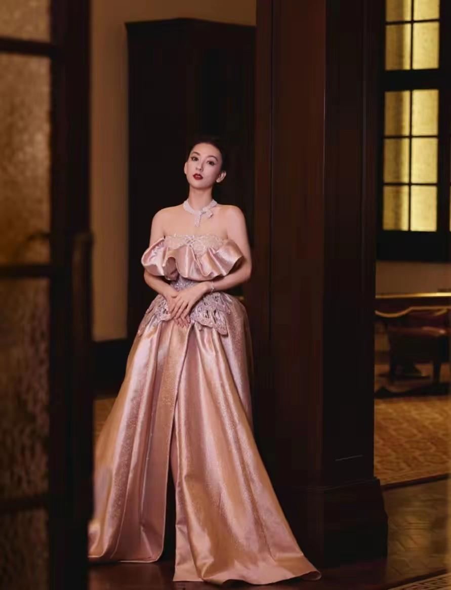 譬如這身粉色抹胸長裙搭配珍珠項鍊造型,也是滿身闊太範,盡顯高貴典雅氣息。