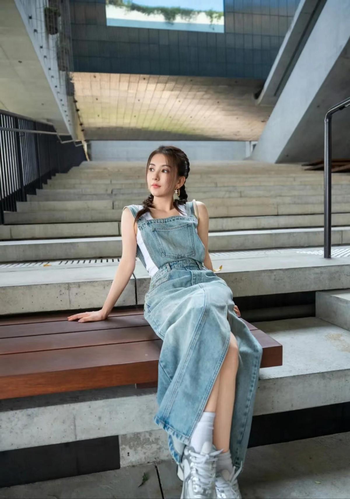 還有這身牛仔連衣裙搭配白色背心,也是活力感十足,年輕得像小姑娘。
